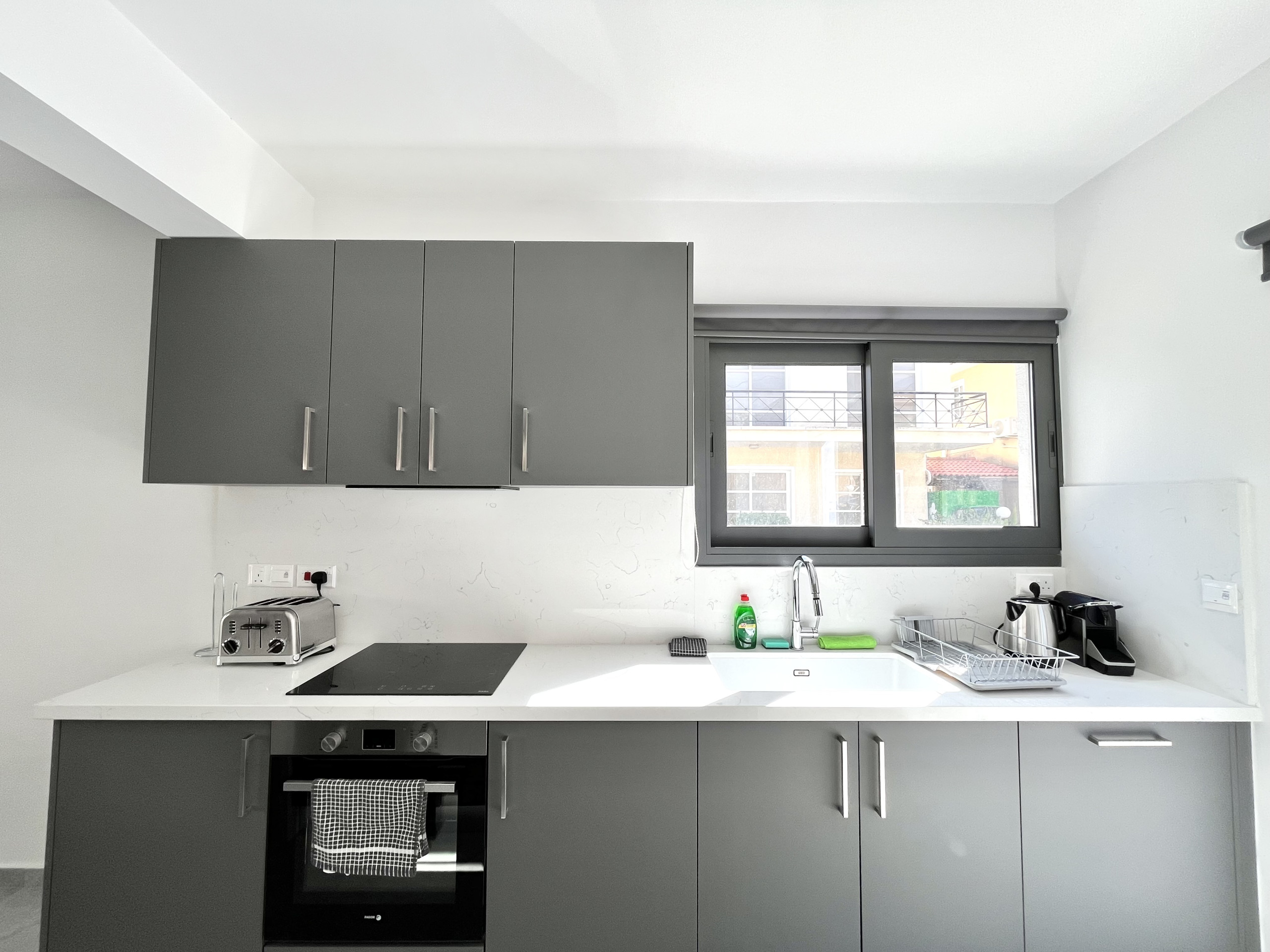Die Offene Küche mit elektrisches Kochfeld ist ausgestattet in einen Kühlschrank, eine Mikrowelle, ein Backofen, eine Spülmaschine, Geschirr/Besteck, Kochutensilien, eine Kaffeemaschine, einen Toaster und einen Wasserkocher.