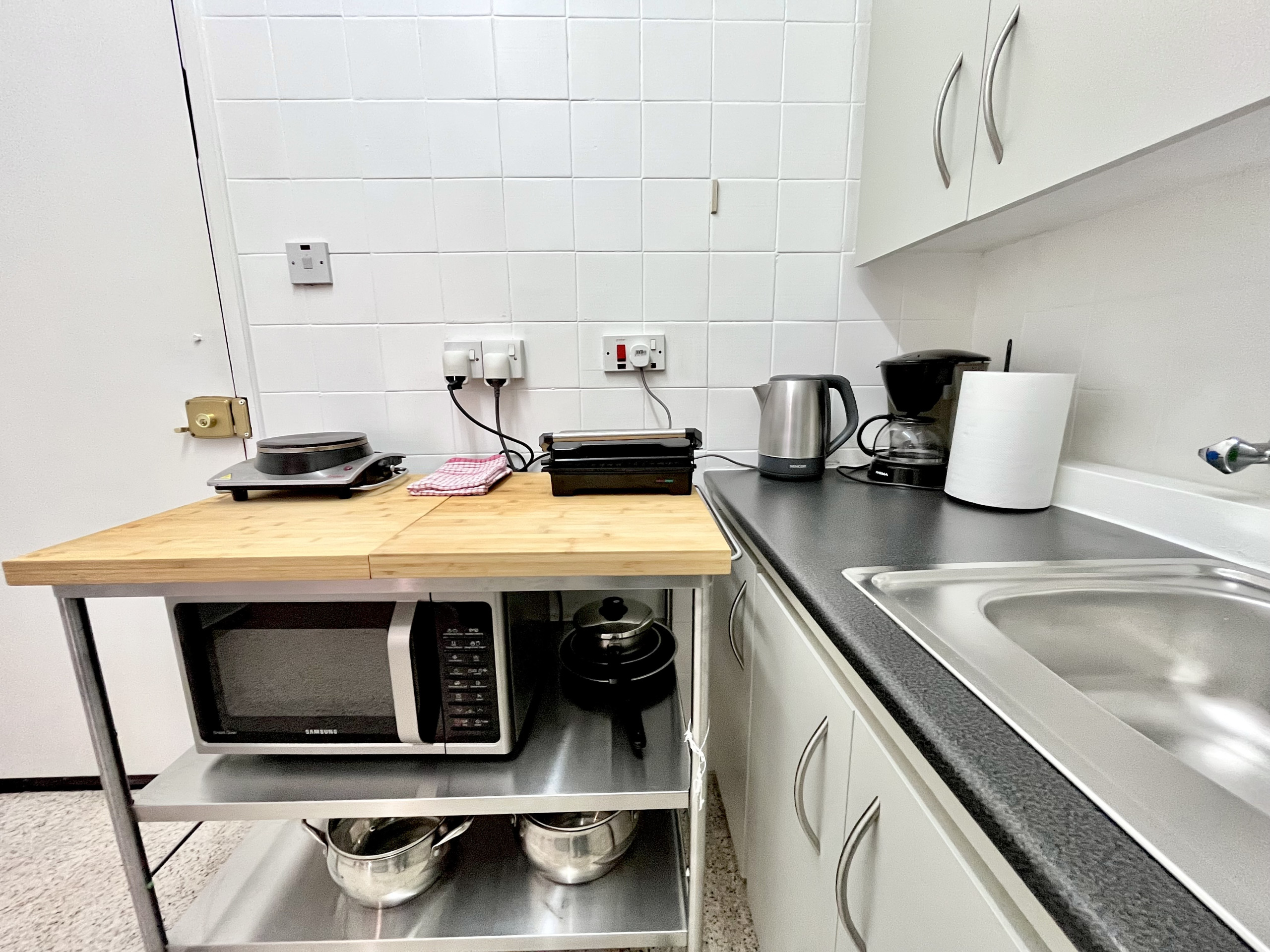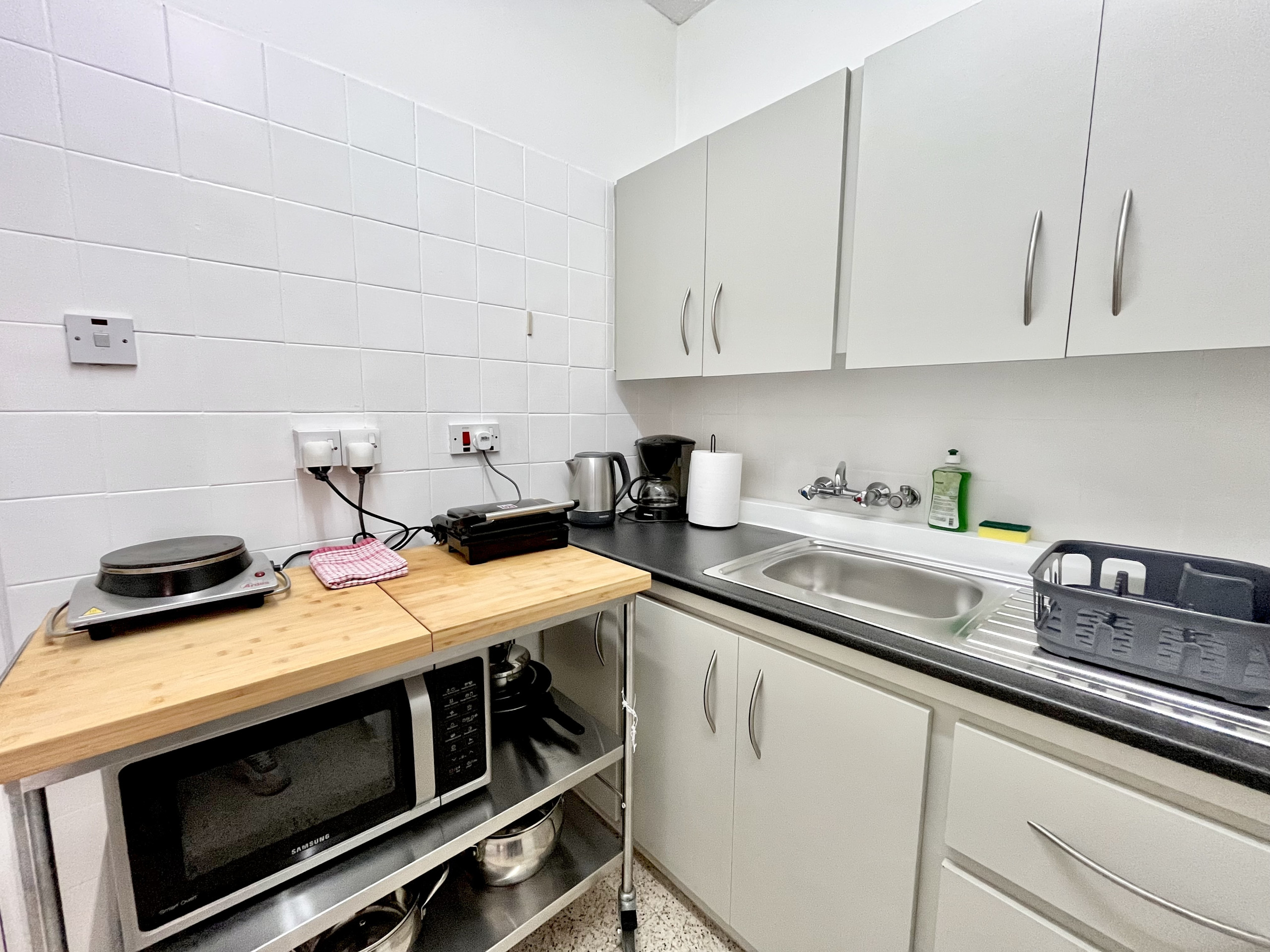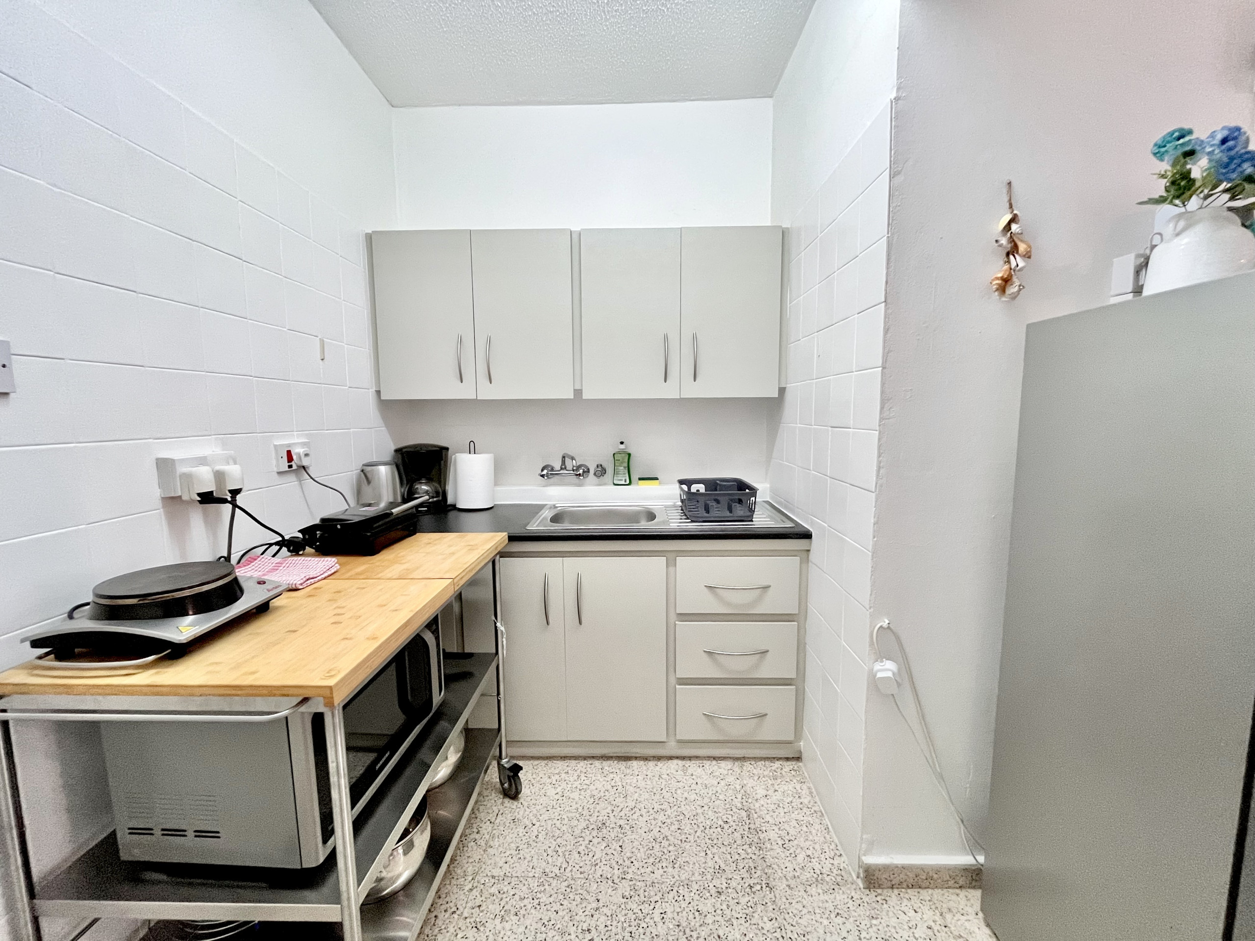 Die Offene Küche mit elektrisches Kochfeld ist ausgestattet in einen Kühlschrank, eine Mikrowelle, Geschirr/Besteck, Kochutensilien, einen Toaster und einen Wasserkocher.