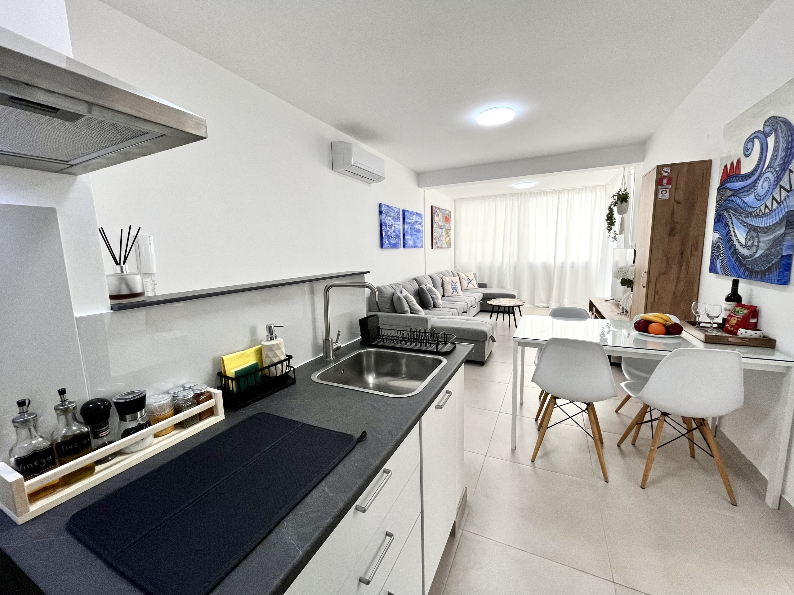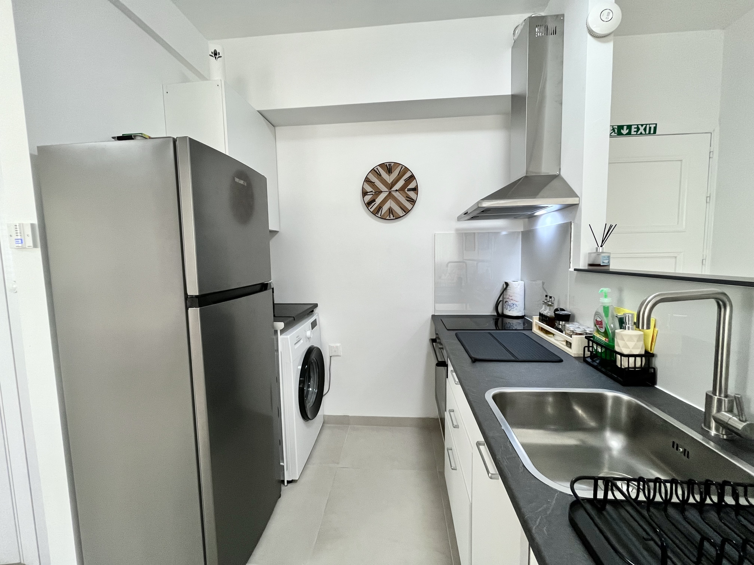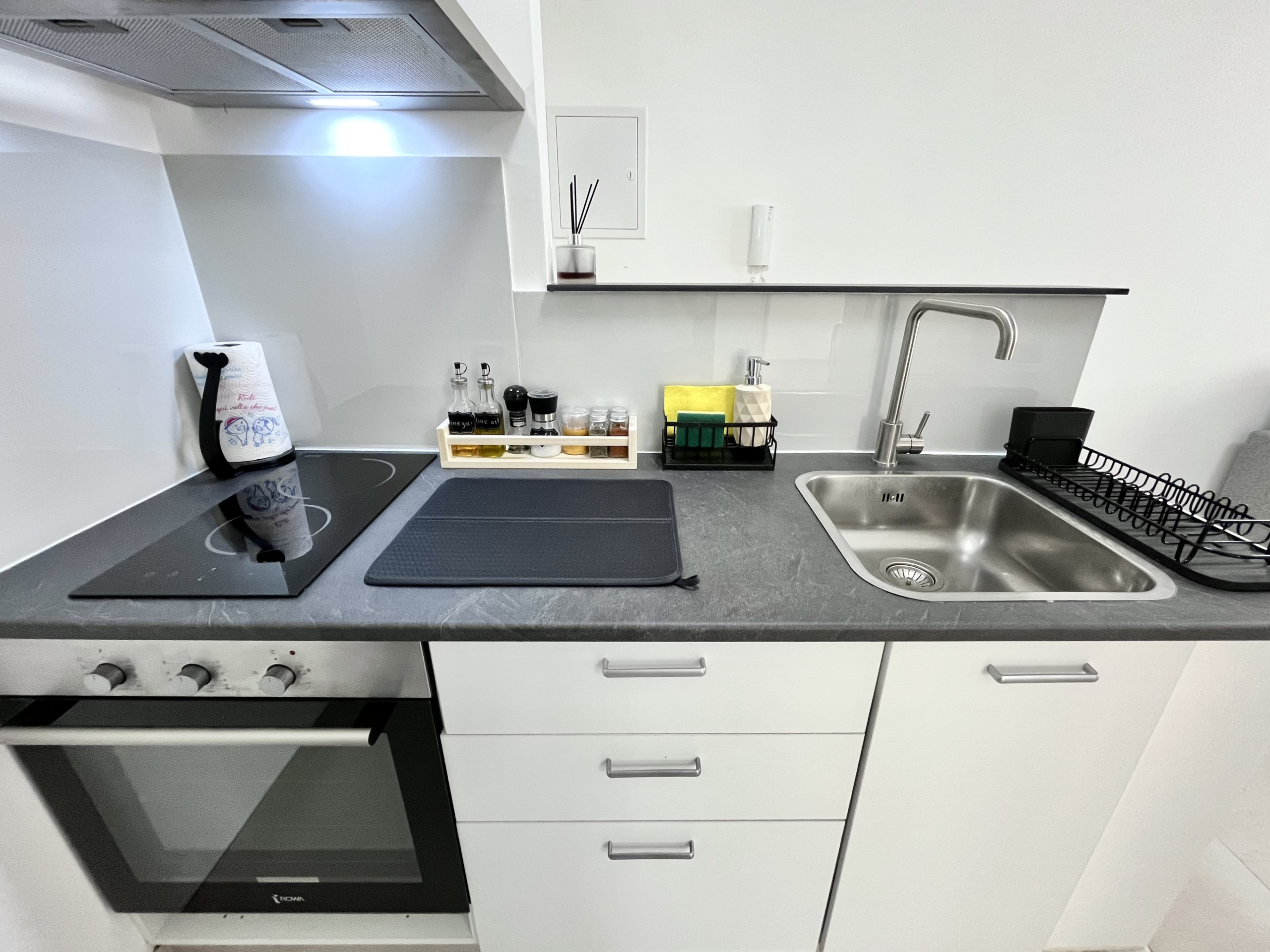 Die Offene Küche mit elektrisches Kochfeld ist ausgestattet in einen Kühlschrank, ein Backofen, Geschirr/Besteck, Kochutensilien, eine Kaffeemaschine und einen Wasserkocher.
