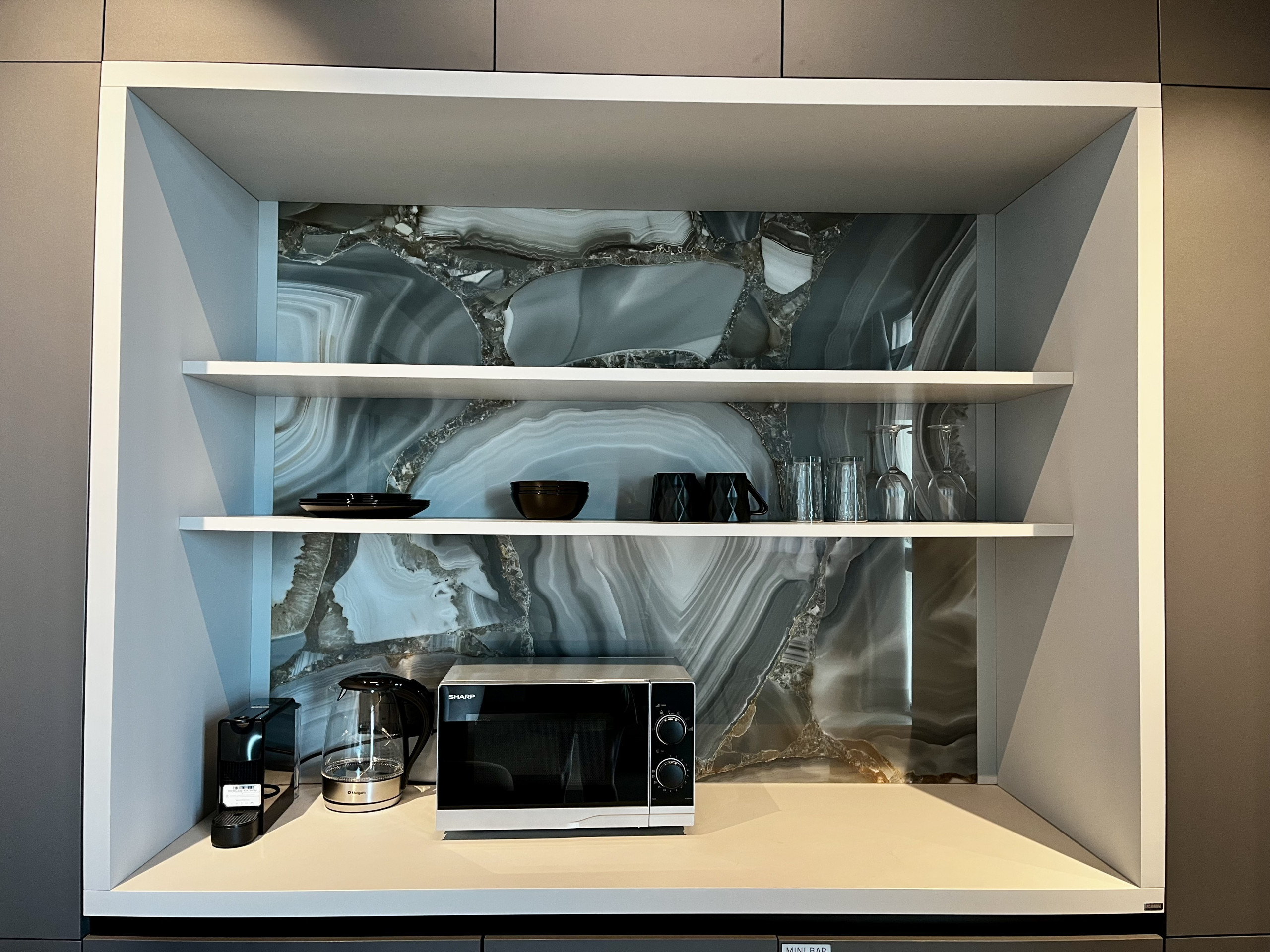 Die Küche ist ausgestattet in einen Kühlschrank, eine Mikrowelle, Geschirr/Besteck, eine Kaffeemaschine und einen Wasserkocher.