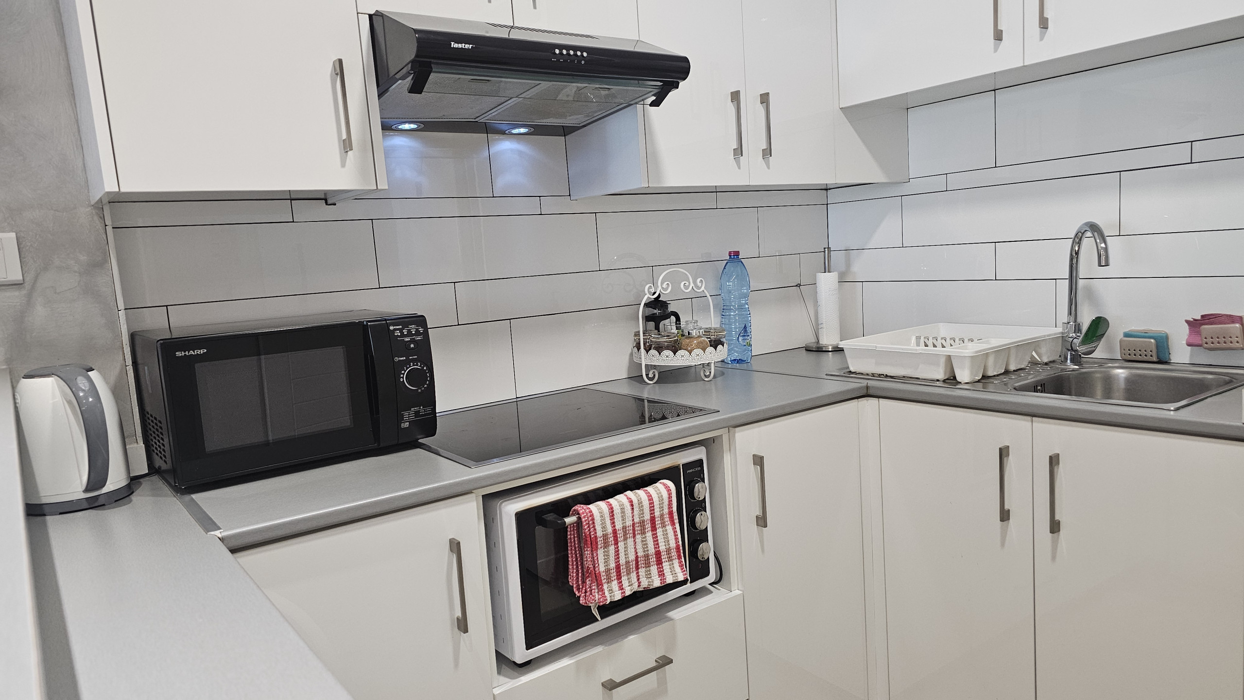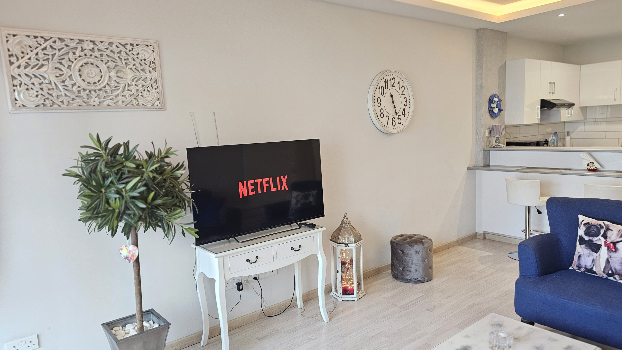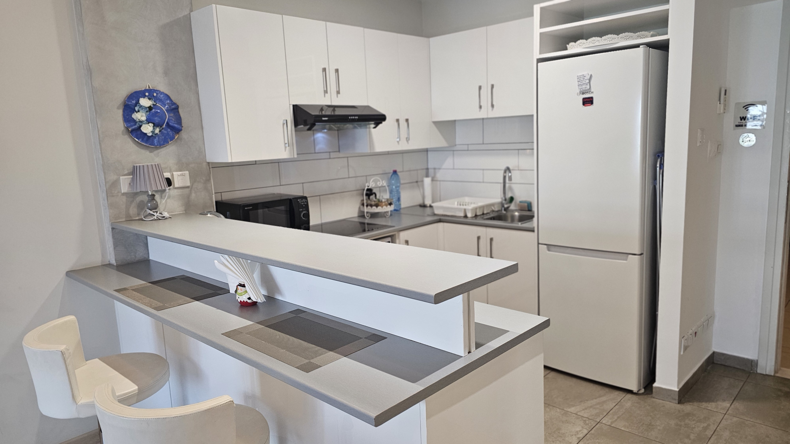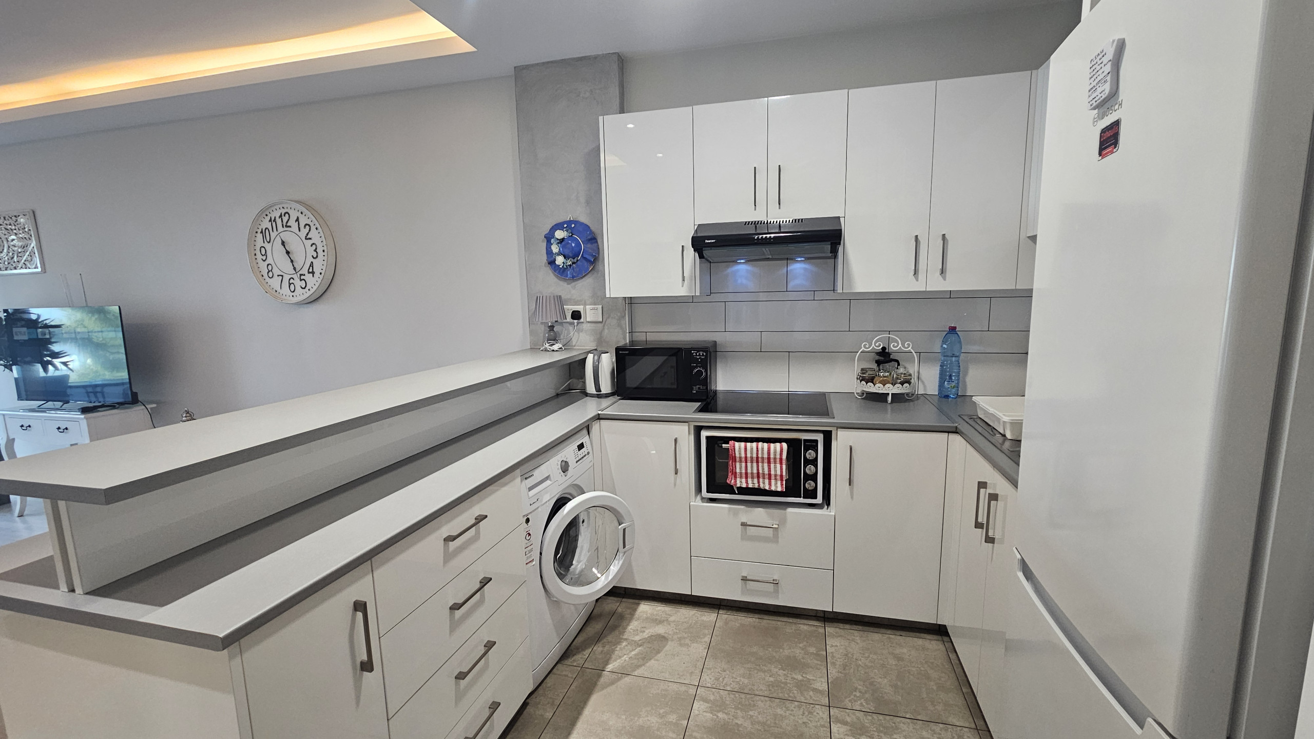 Beim Betreten werden Sie einen durchdacht gestalteten Wohn-Essbereich entdecken. Der Raum verfügt über ein gemütliches Sofa, einen Smart-TV für Ihre Unterhaltung und eine voll ausgestattete Küche. In der Küche finden Sie alles, was Sie benötigen, um fast jedes Gericht zuzubereiten, was ihn zu einem perfekten Ort für Entspannung und kulinarische Abenteuer macht.