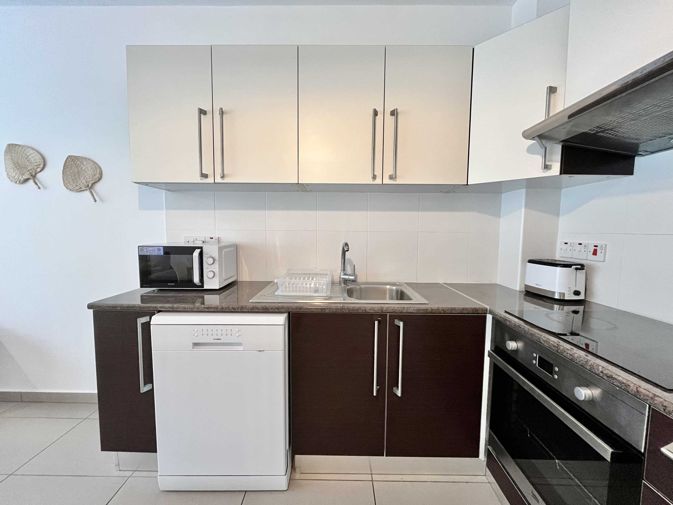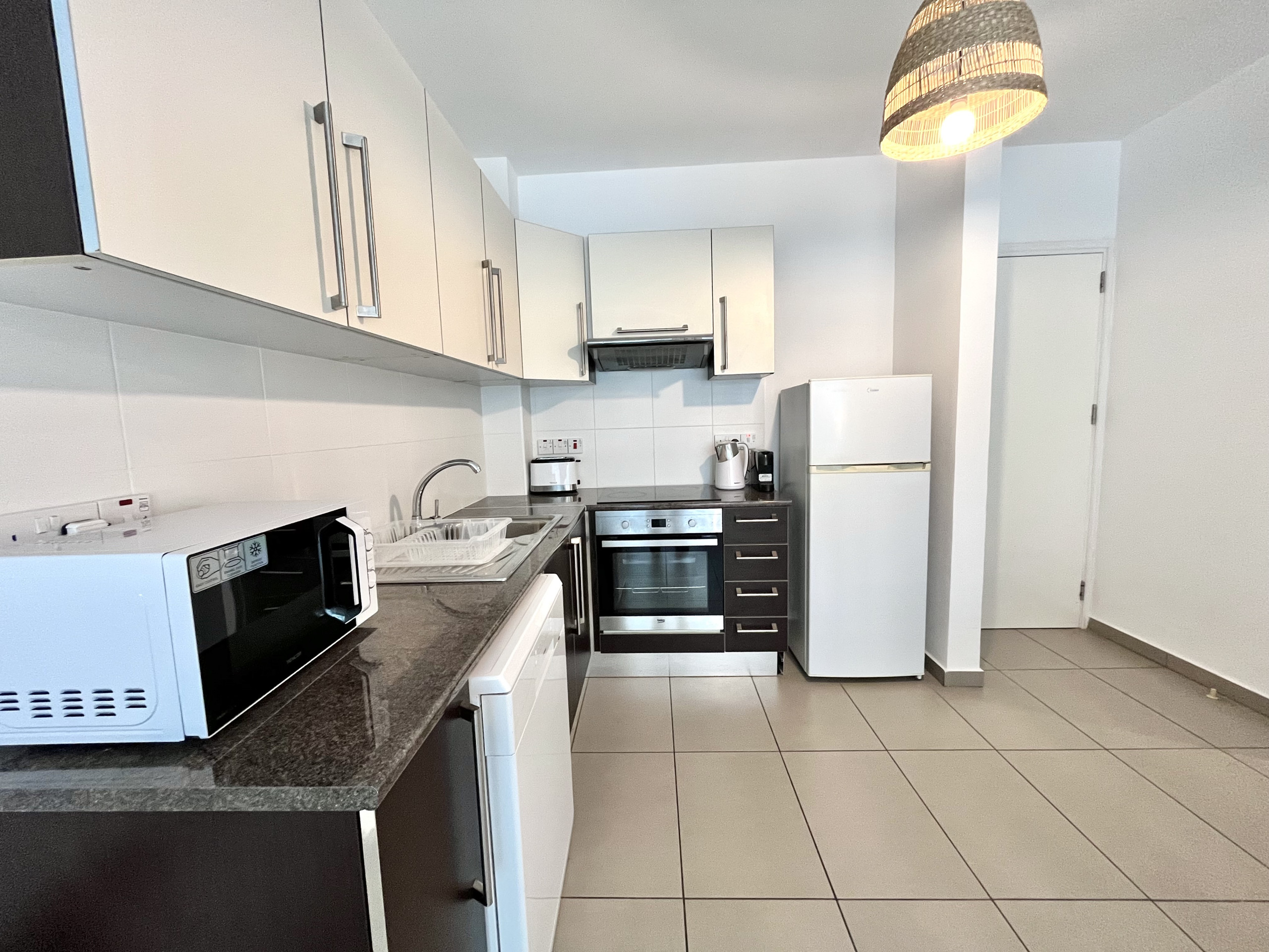 Die Offene Küche mit elektrisches Kochfeld ist ausgestattet in einen Kühlschrank, eine Mikrowelle, ein Backofen, eine Spülmaschine, Geschirr/Besteck, Kochutensilien, eine Kaffeemaschine, einen Toaster und einen Wasserkocher.
