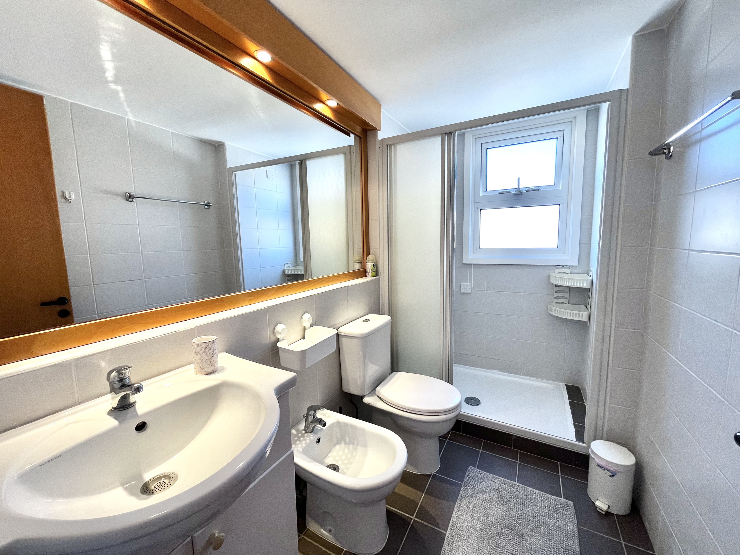 Die Offene Küche mit elektrisches Kochfeld ist ausgestattet in einen Kühlschrank, ein Backofen, eine Spülmaschine, Geschirr/Besteck, Kochutensilien, einen Toaster und einen Wasserkocher.