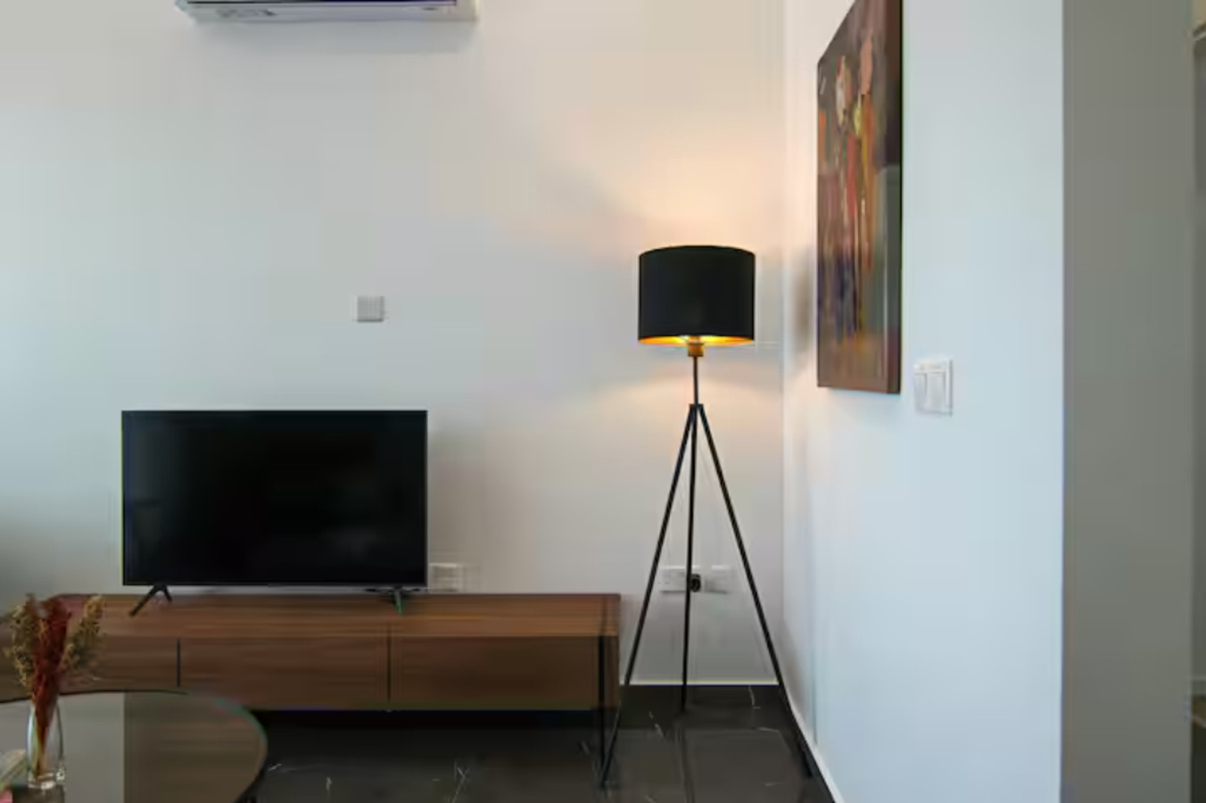 Step into a bright and welcoming apartment in Agios Athanasios, Limassol, where modern comfort meets effortless city living. The open-plan living area is filled with natural light and features a cozy sofa and Smart TV - the perfect place to relax after a day out - while large sliding doors lead you directly to a private balcony with lovely skyline views, ideal for morning coffee or an evening drink.