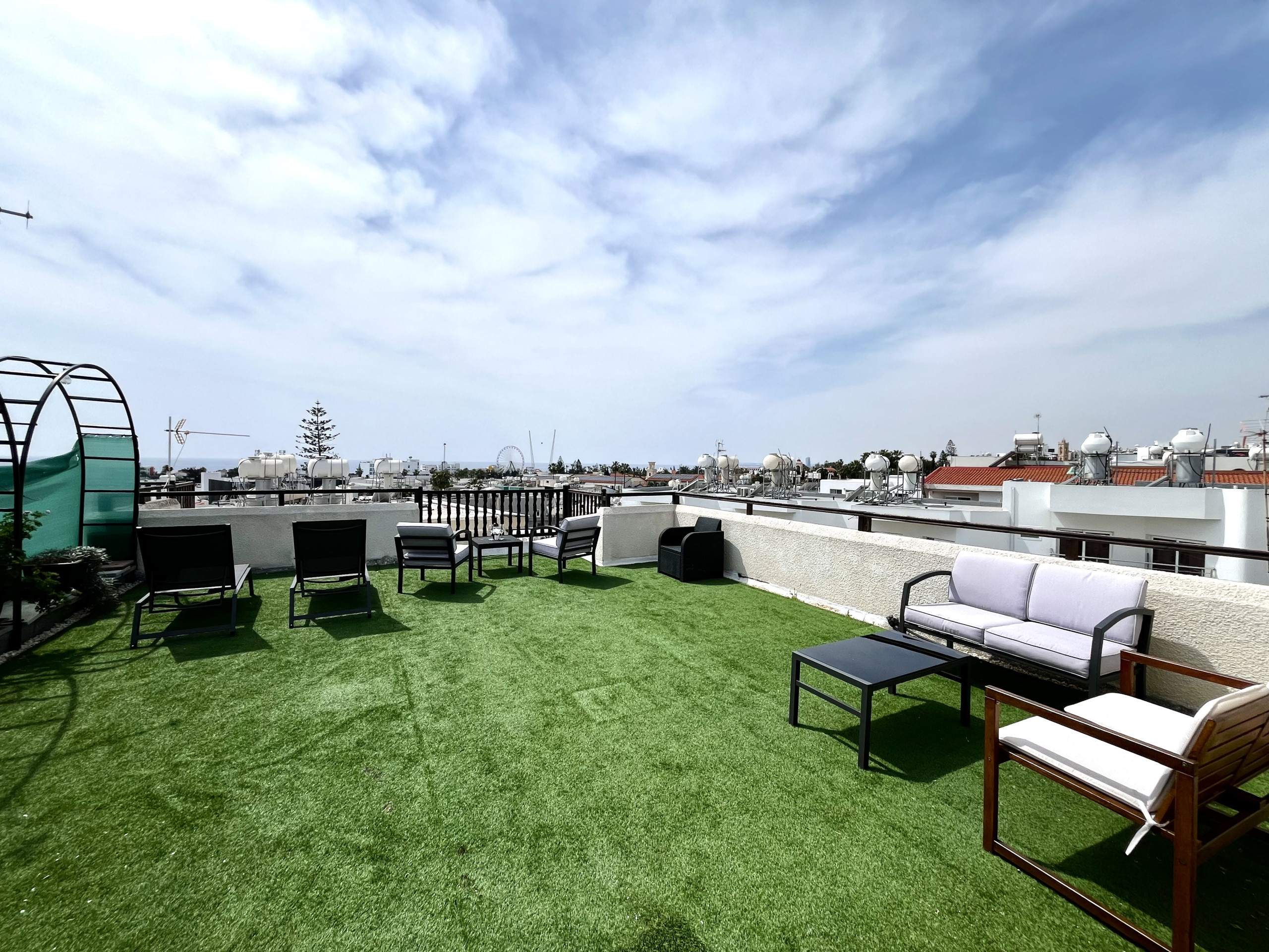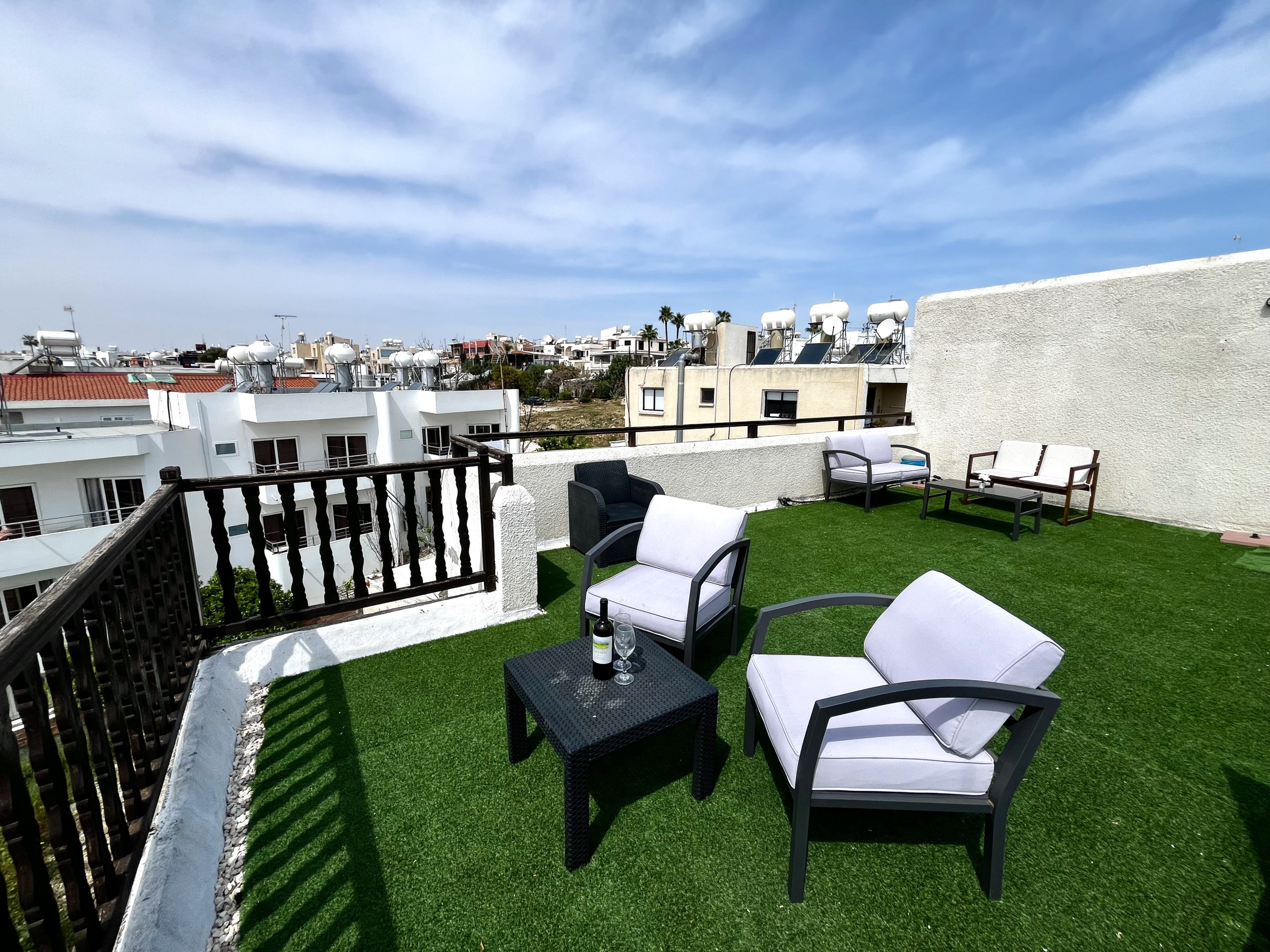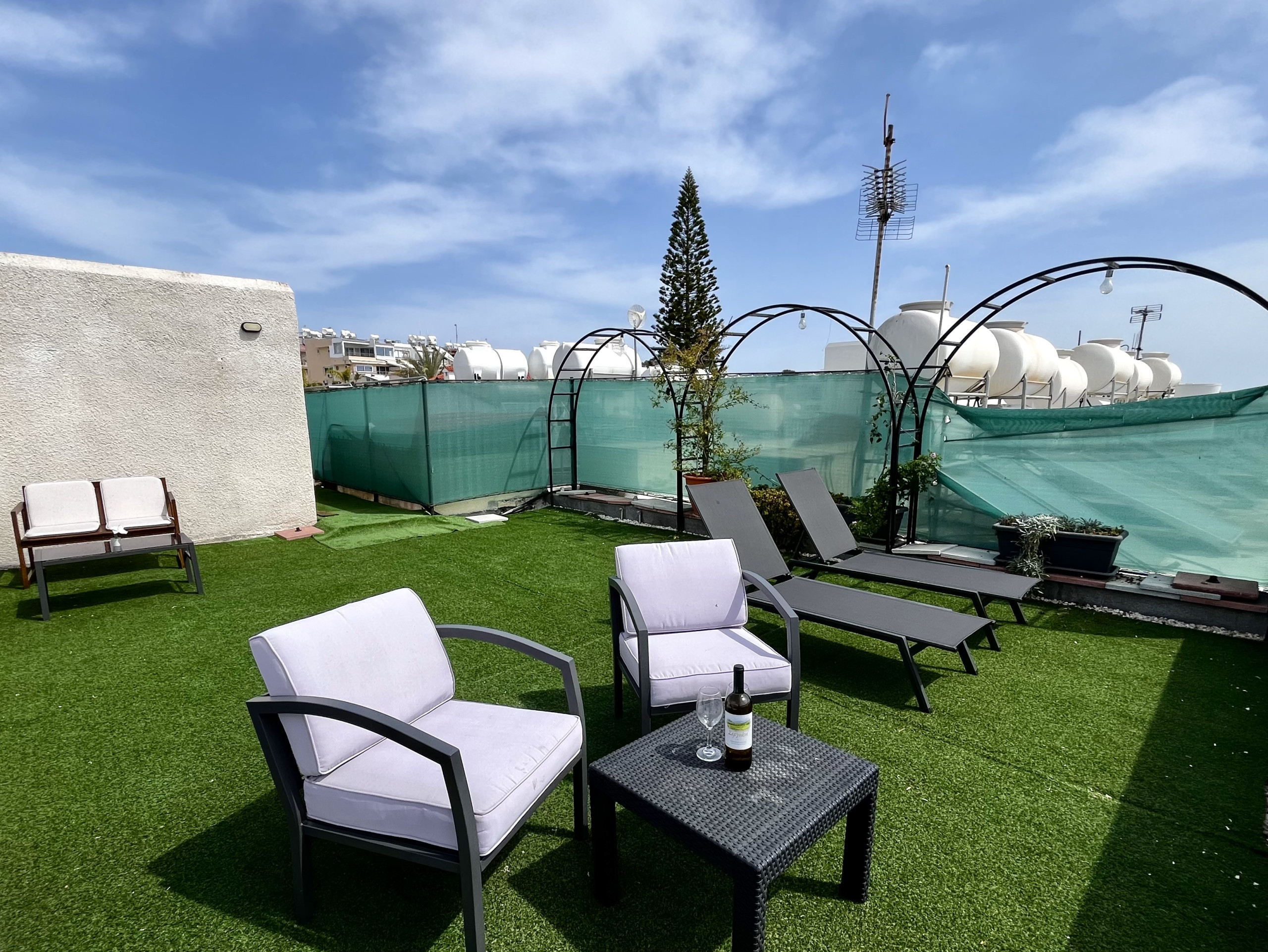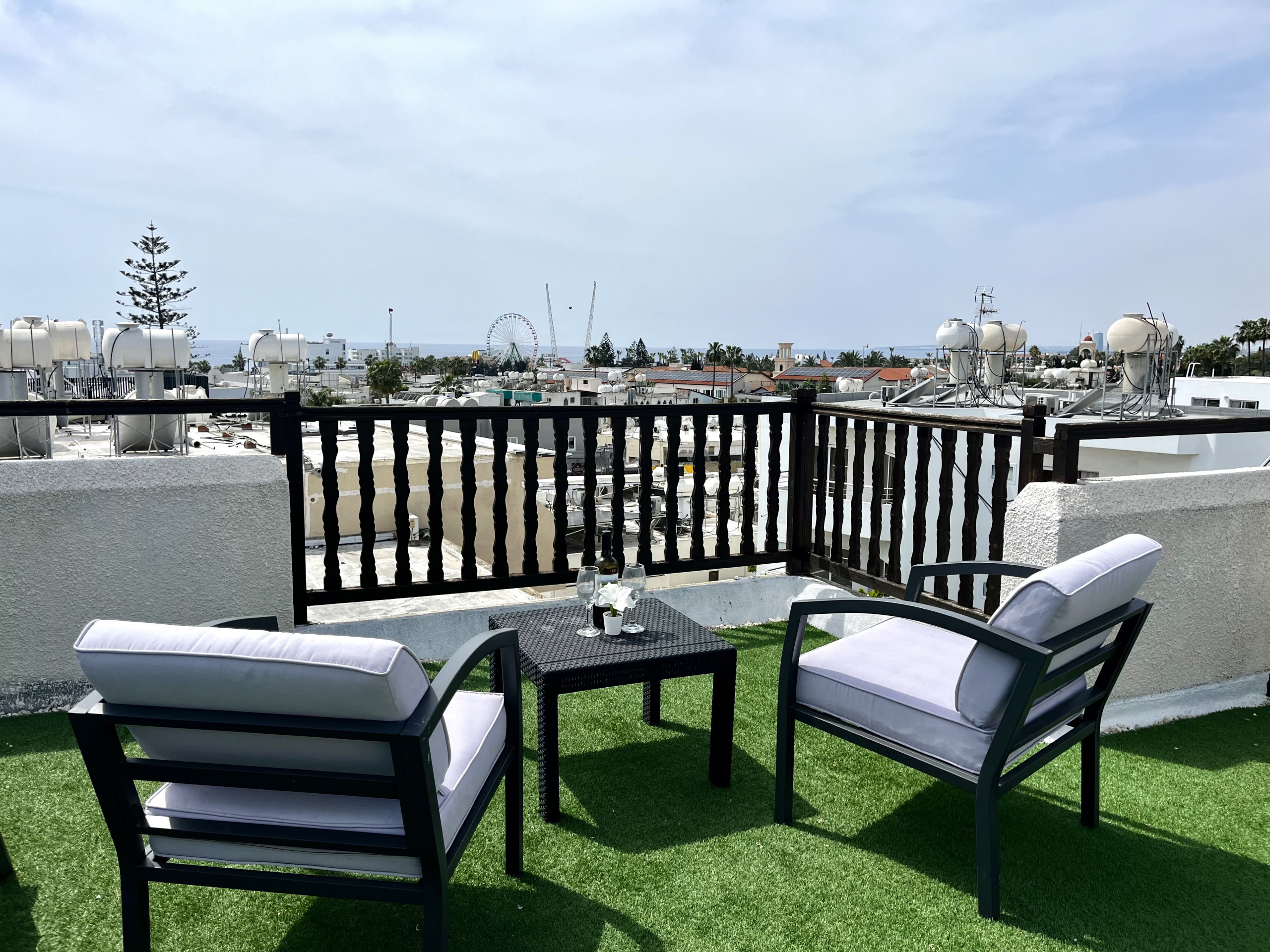 This 2 bedroom fully air-conditioned apartment (50m²) comfortably accommodates 4 persons in one double bed and two single beds include a cozy open plan fully equipped kitchen with the living area which opens up to a lovely balcony with garden view. Upstairs you will find a private rooftop with amazing sea views and city views over Ayia Napa, is perfect for gathering, sunbathing, or searching for the brightest stars in the night sky. A washing machine is available free of charge at the common area of the building.