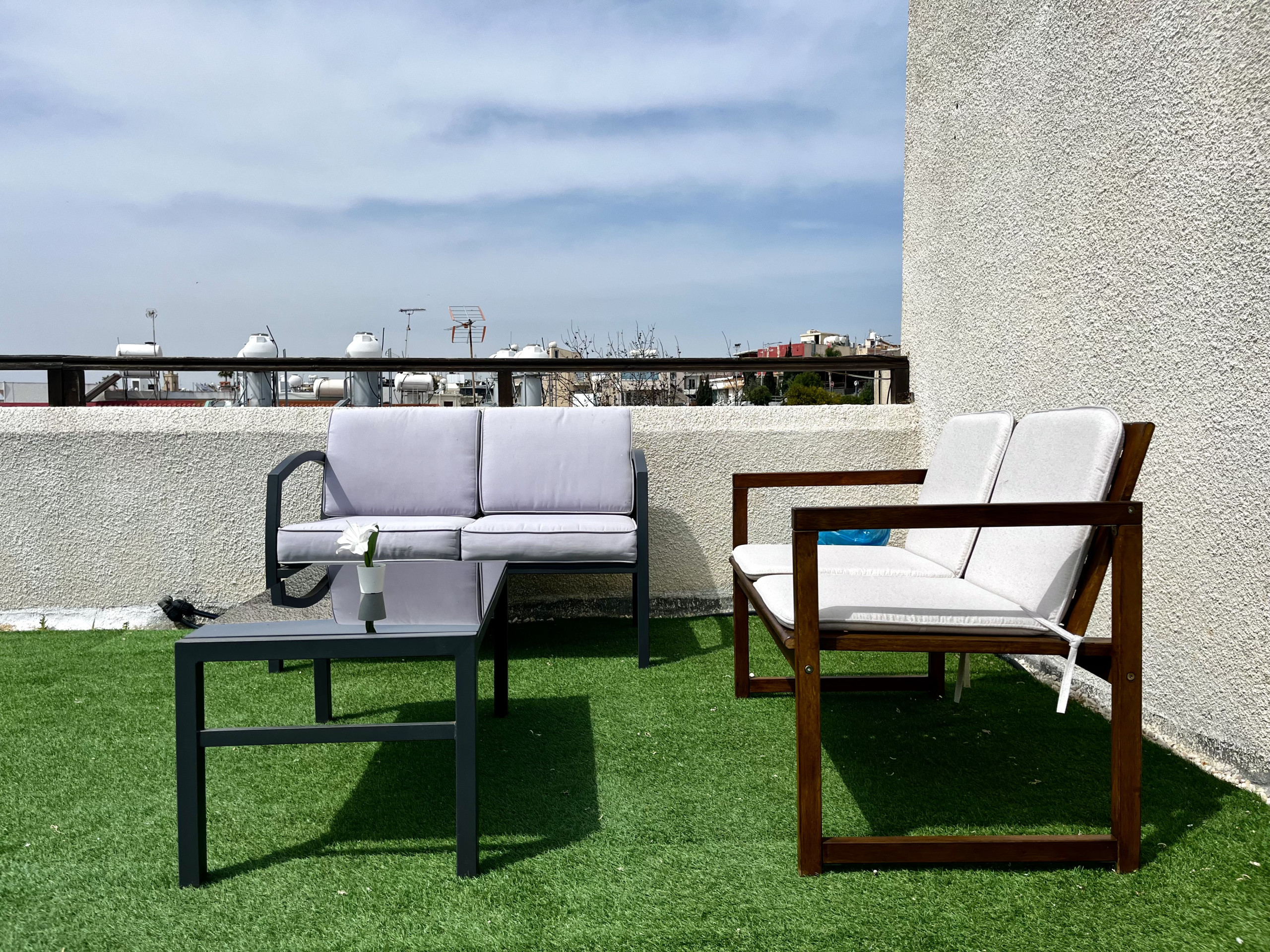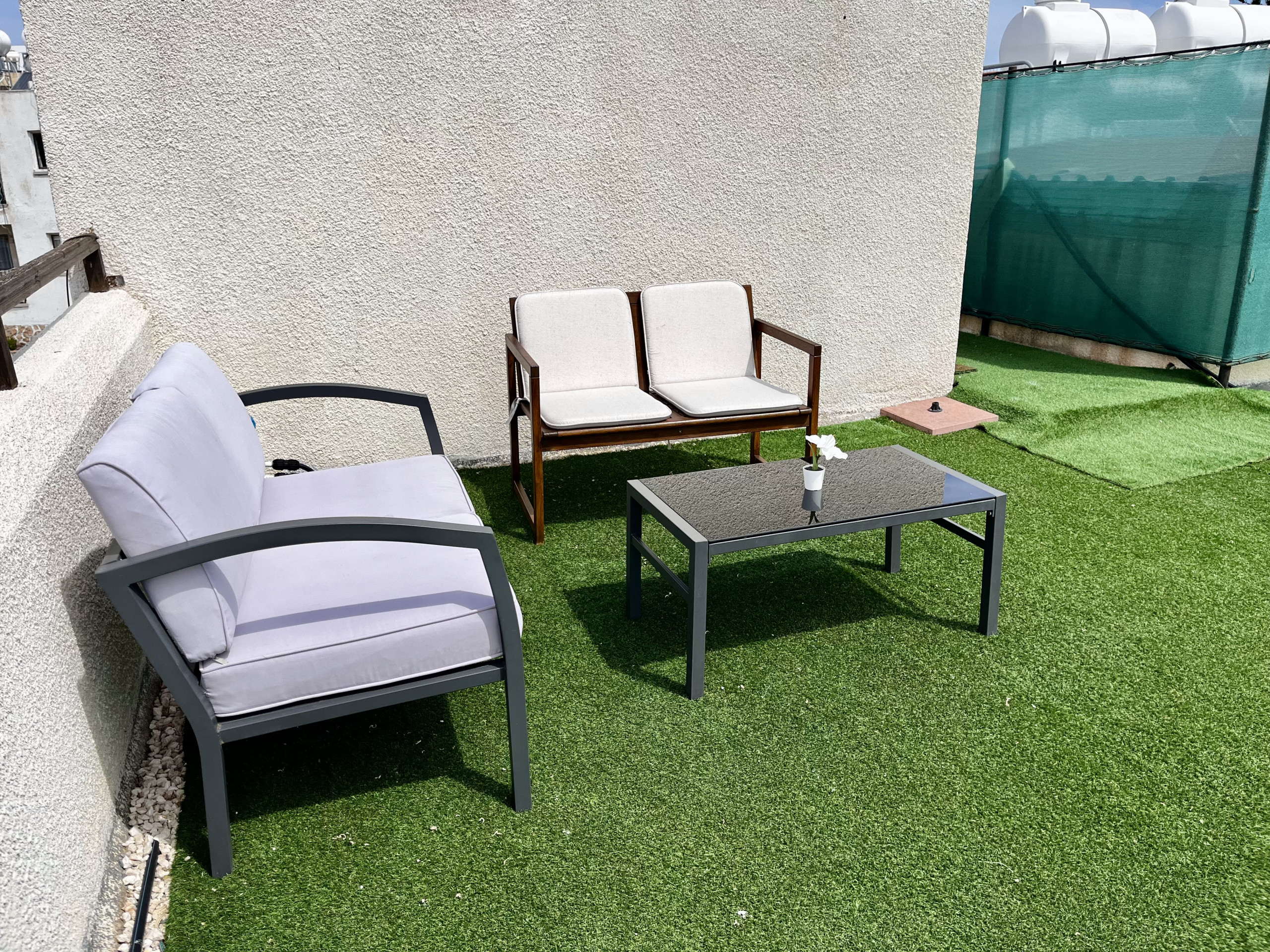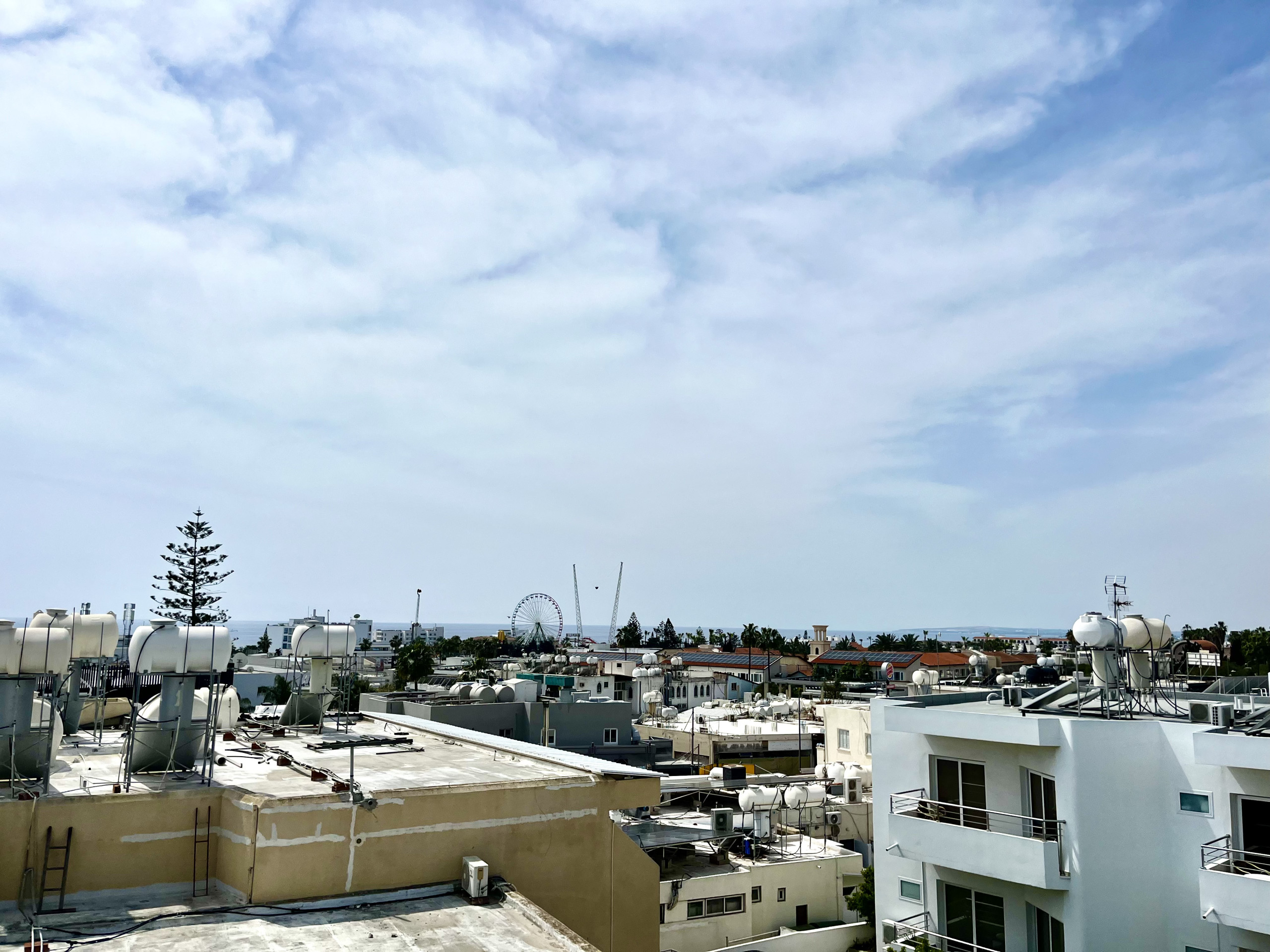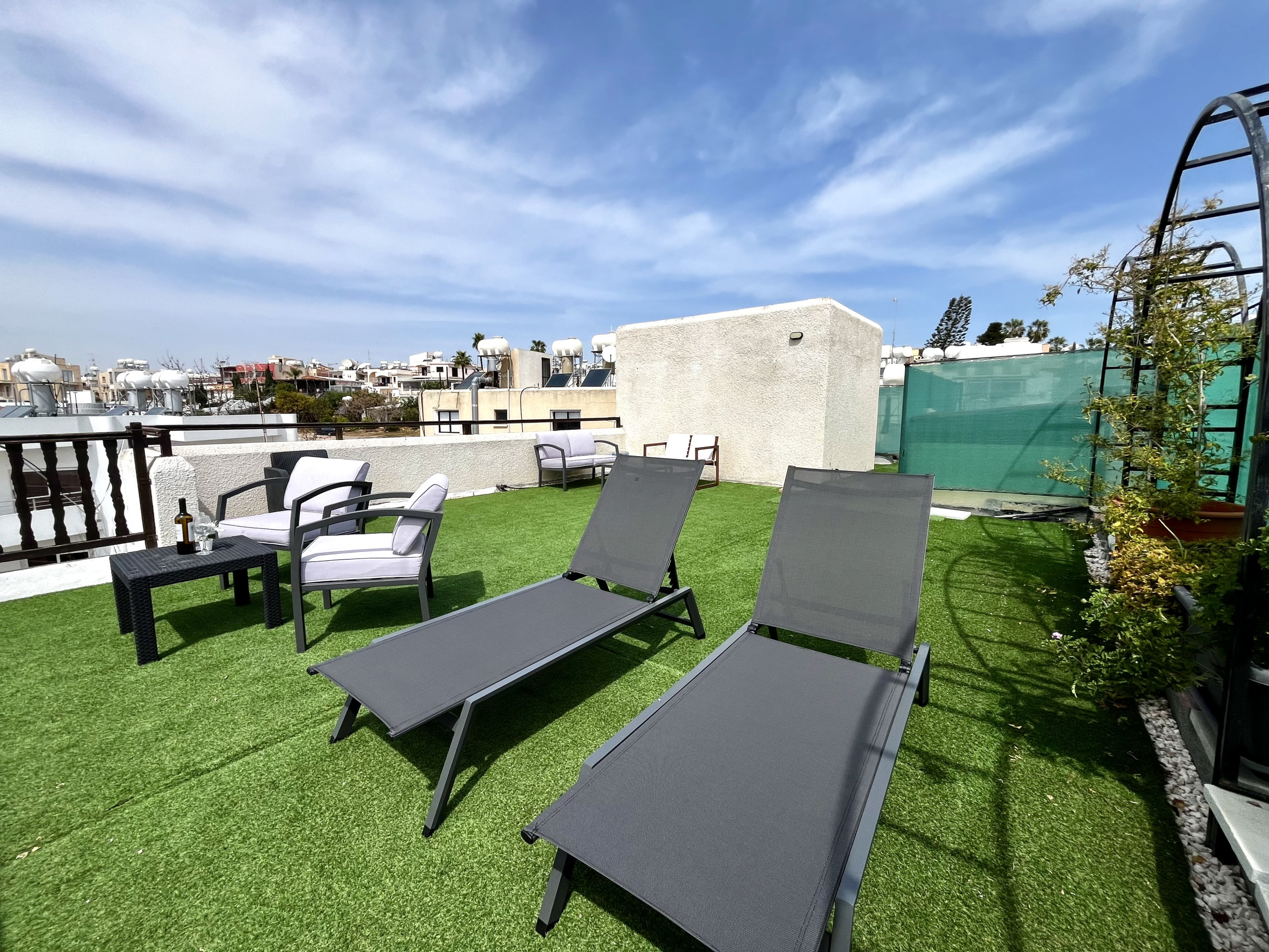 This 2 bedroom fully air-conditioned apartment (50m²) comfortably accommodates 4 persons in one double bed and two single beds include a cozy open plan fully equipped kitchen with the living area which opens up to a lovely balcony with garden view. Upstairs you will find a private rooftop with amazing sea views and city views over Ayia Napa, is perfect for gathering, sunbathing, or searching for the brightest stars in the night sky. A washing machine is available free of charge at the common area of the building.