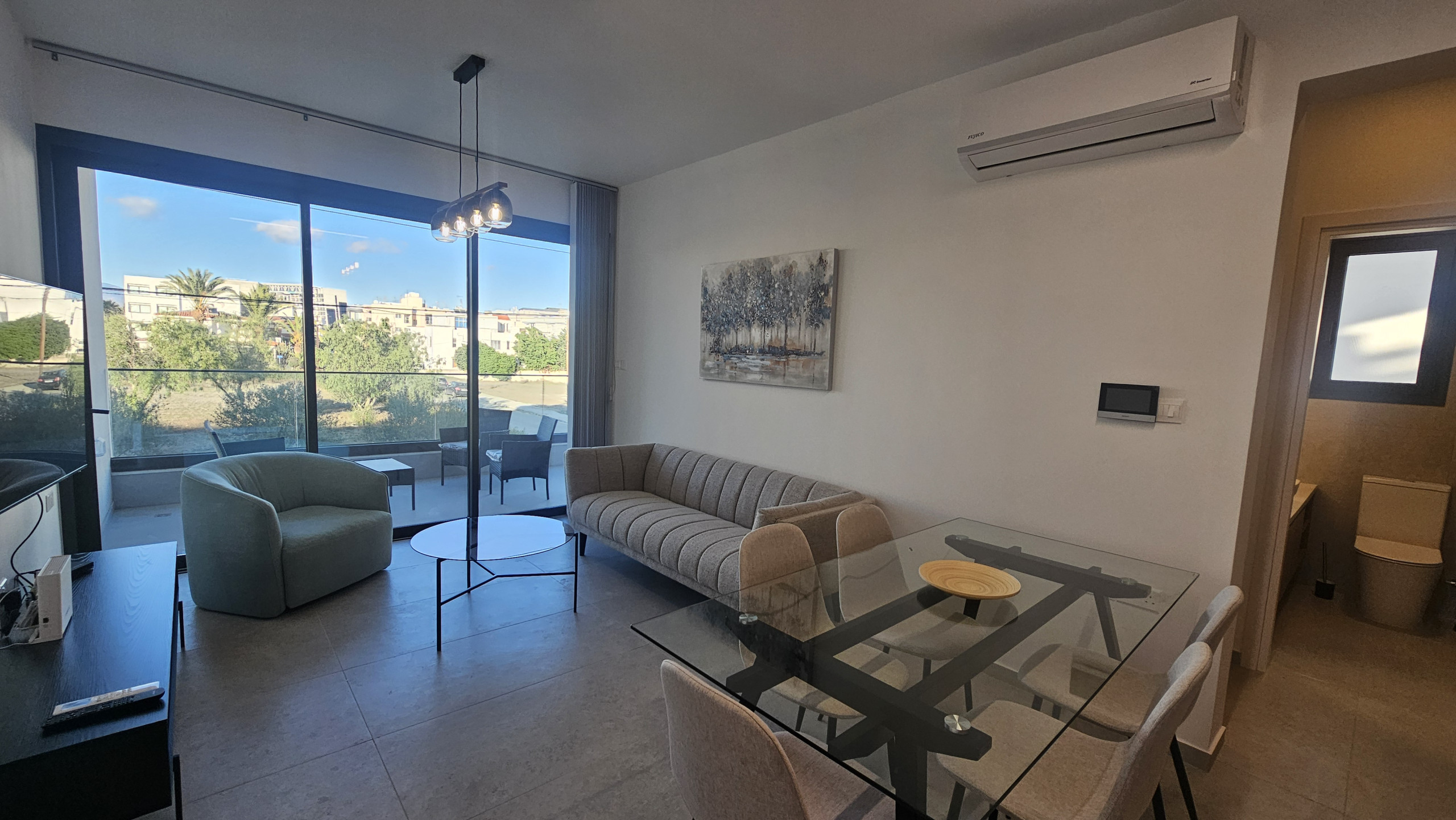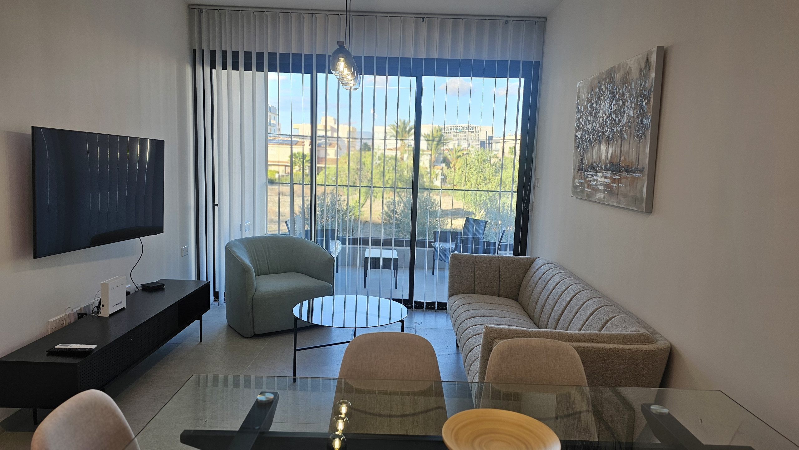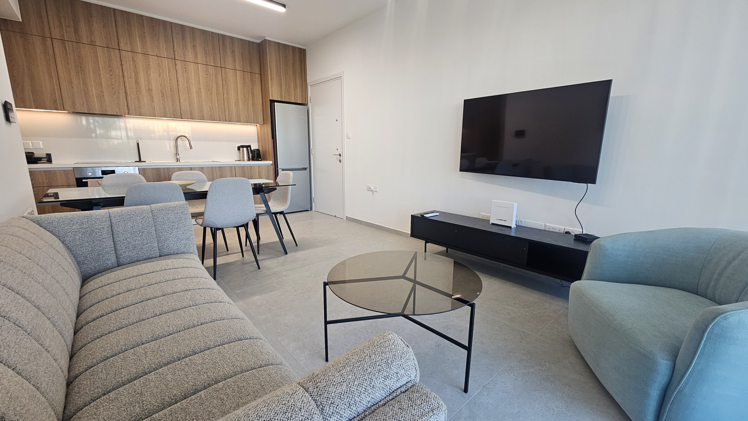 As you step inside the apartment, you will find an open living space that features a comfortable sofa bed, a TV, a fully equipped kitchen and a dining table.
