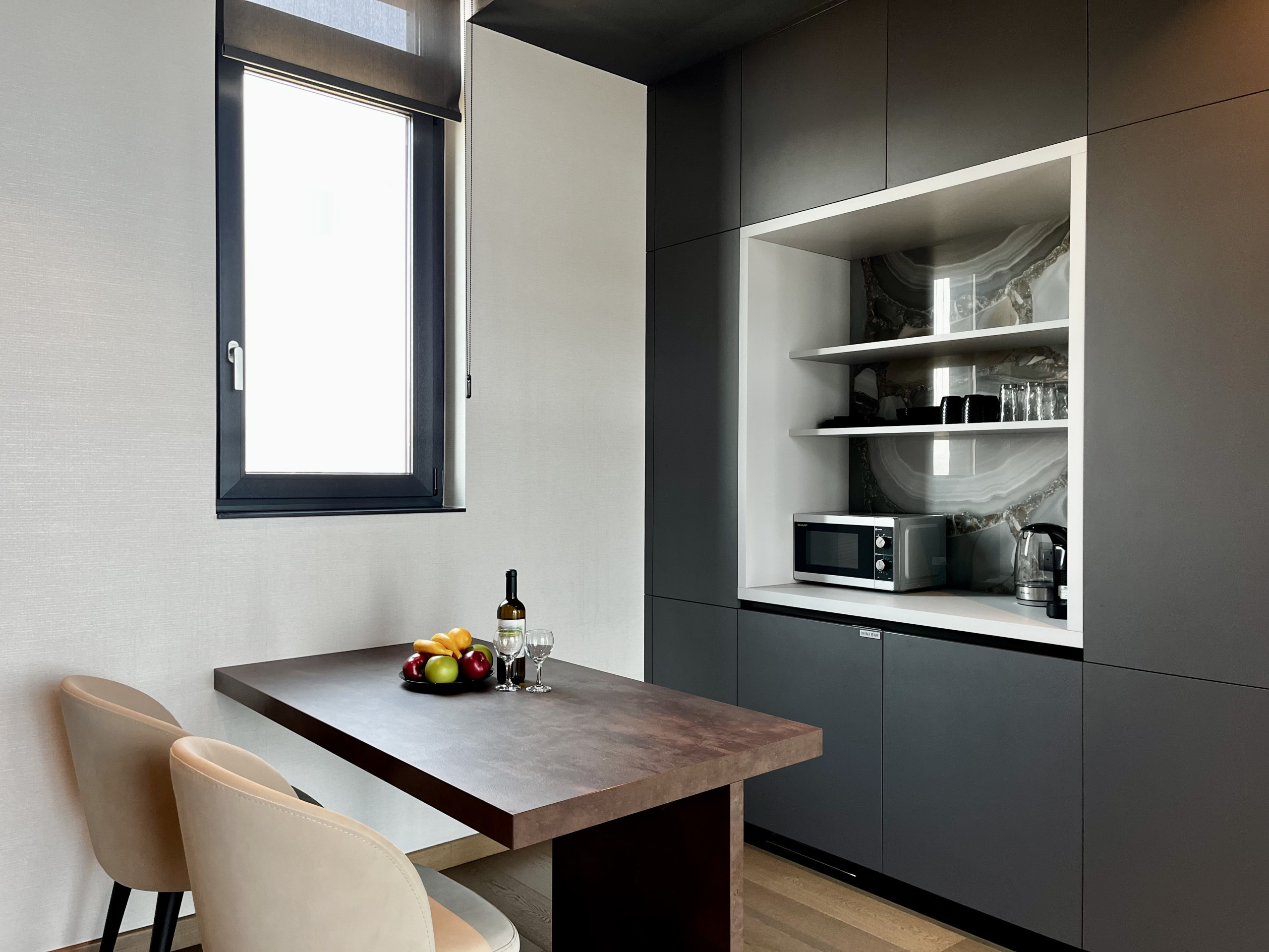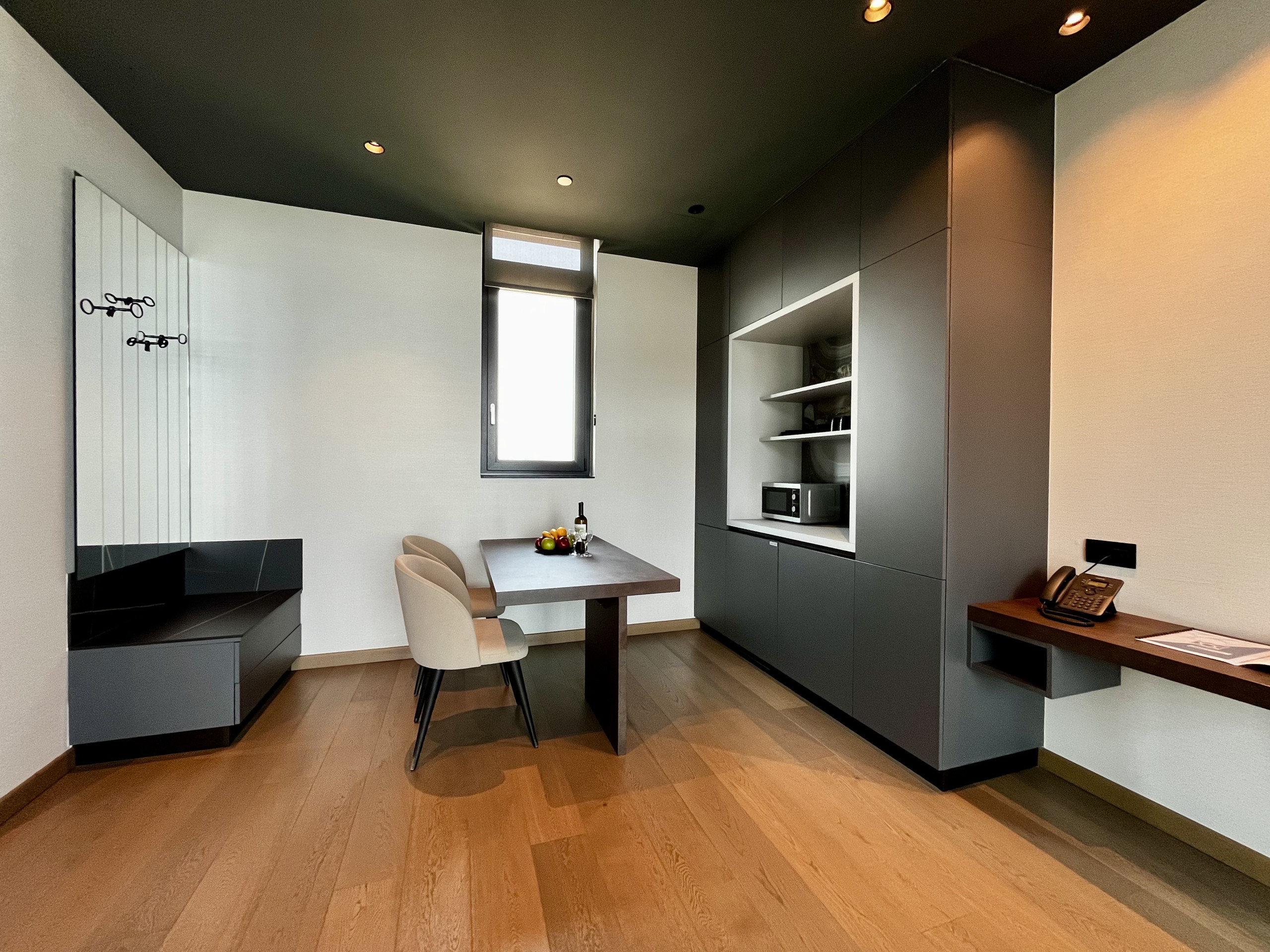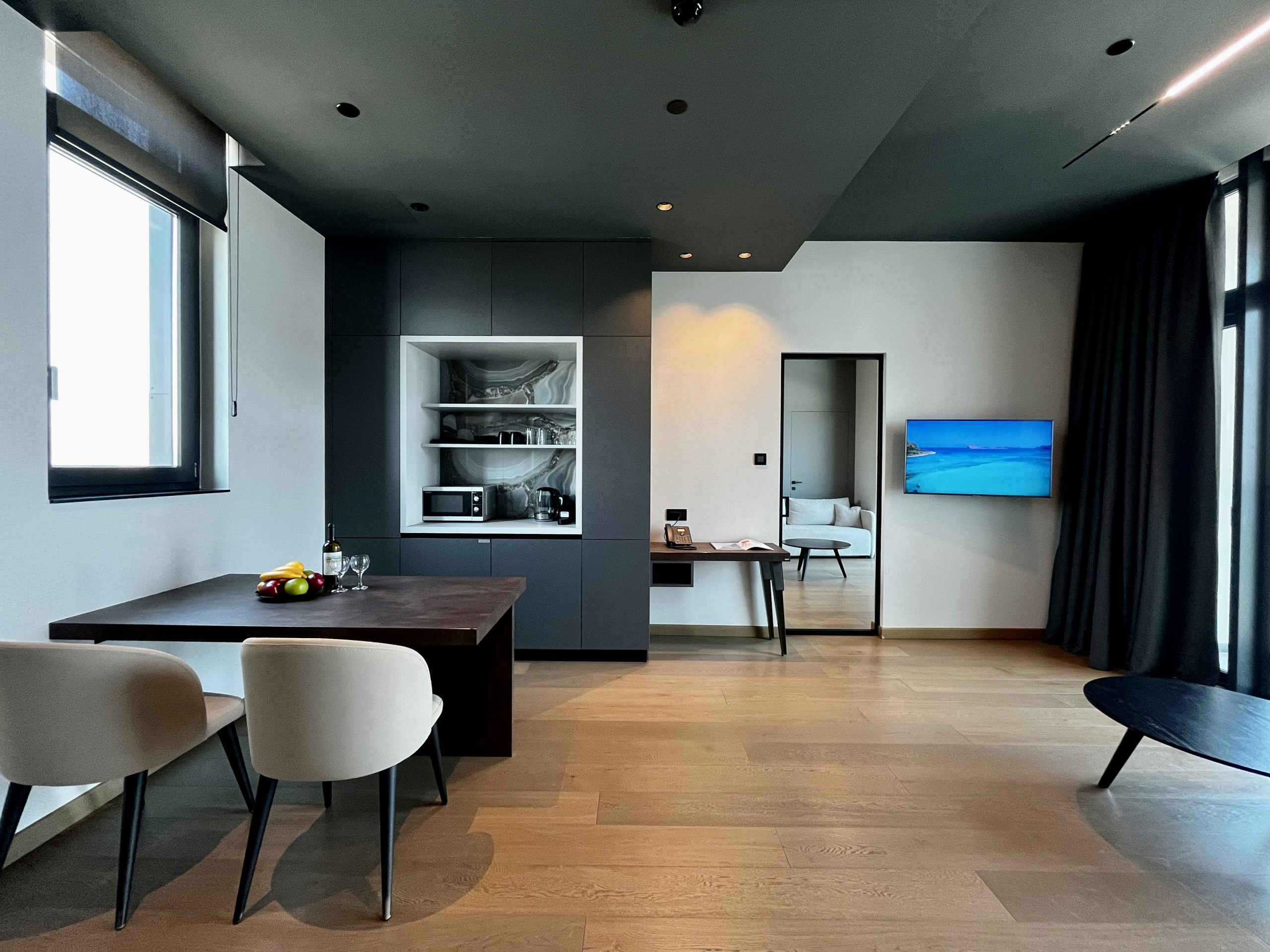 The layout includes a cozy living area with Smart TV, a dedicated workspace with desk and Wi‑Fi and a tasteful dining nook. The kitchenette features a microwave, mini fridge, and coffee machine.