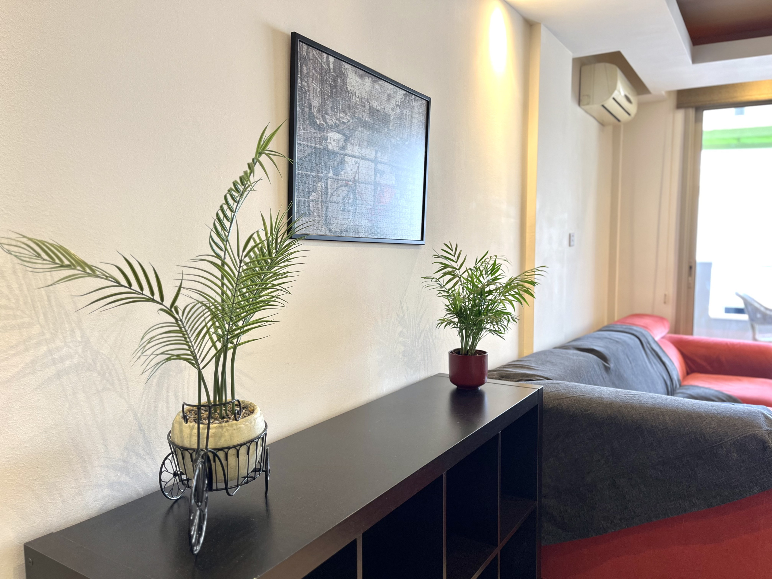 As you step inside the apartment, you will find an open living space that features a comfortable sofa bed, a TV, a fully equipped kitchen with a wahing machine and a dishwasher, a dining table, and large sliding doors that let ample light come through and light up the space.