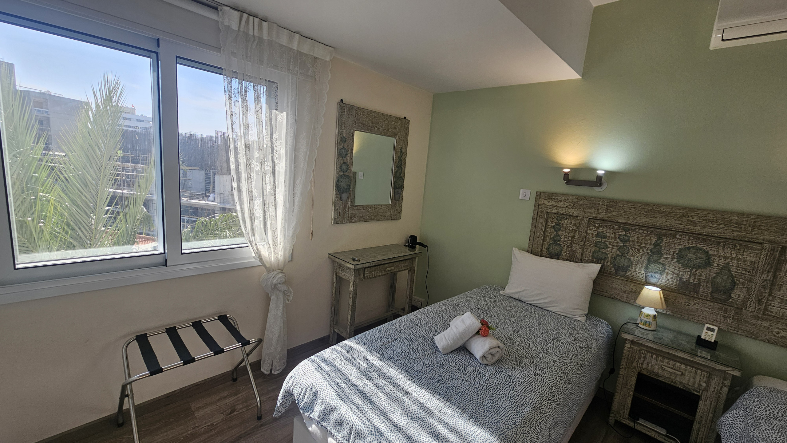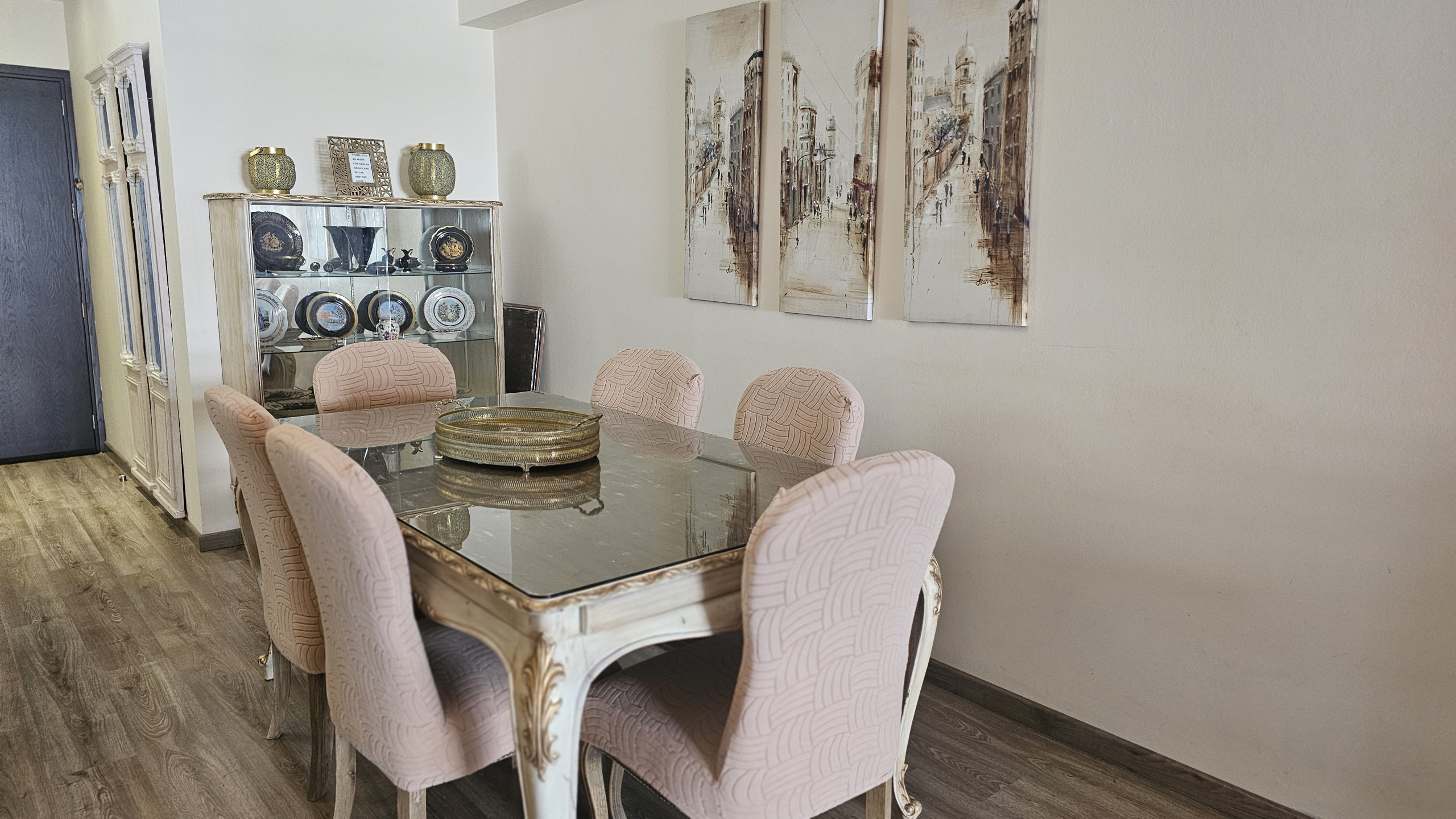 The apartment has 2 bedrooms. The master bedroom is a tranquil retreat, boasting a double king-size bed with a plush mattress that promises a restful and comfortable sleep. The second bedroom has two single beds. Both bedrooms have AC units and wardrobes.