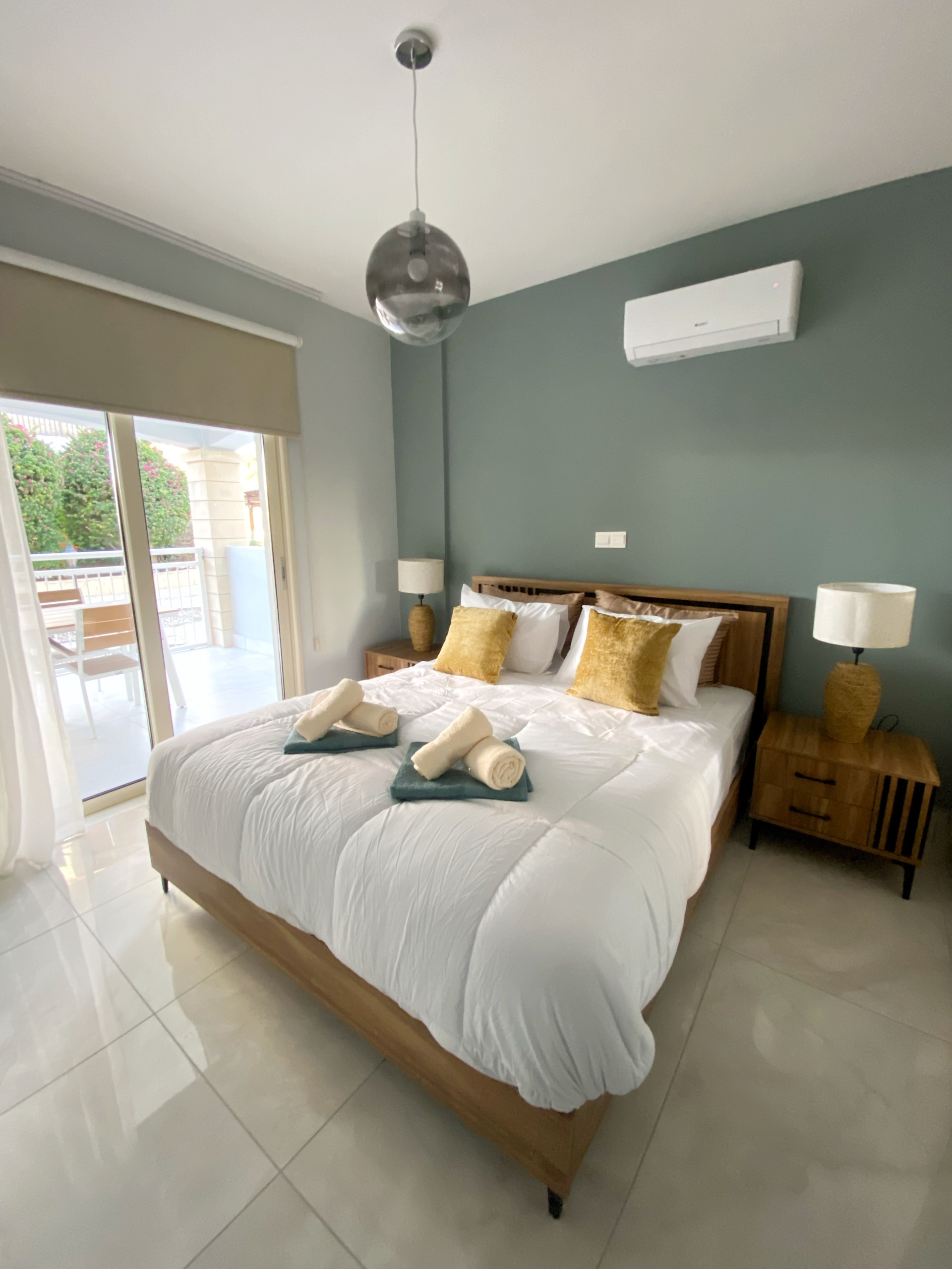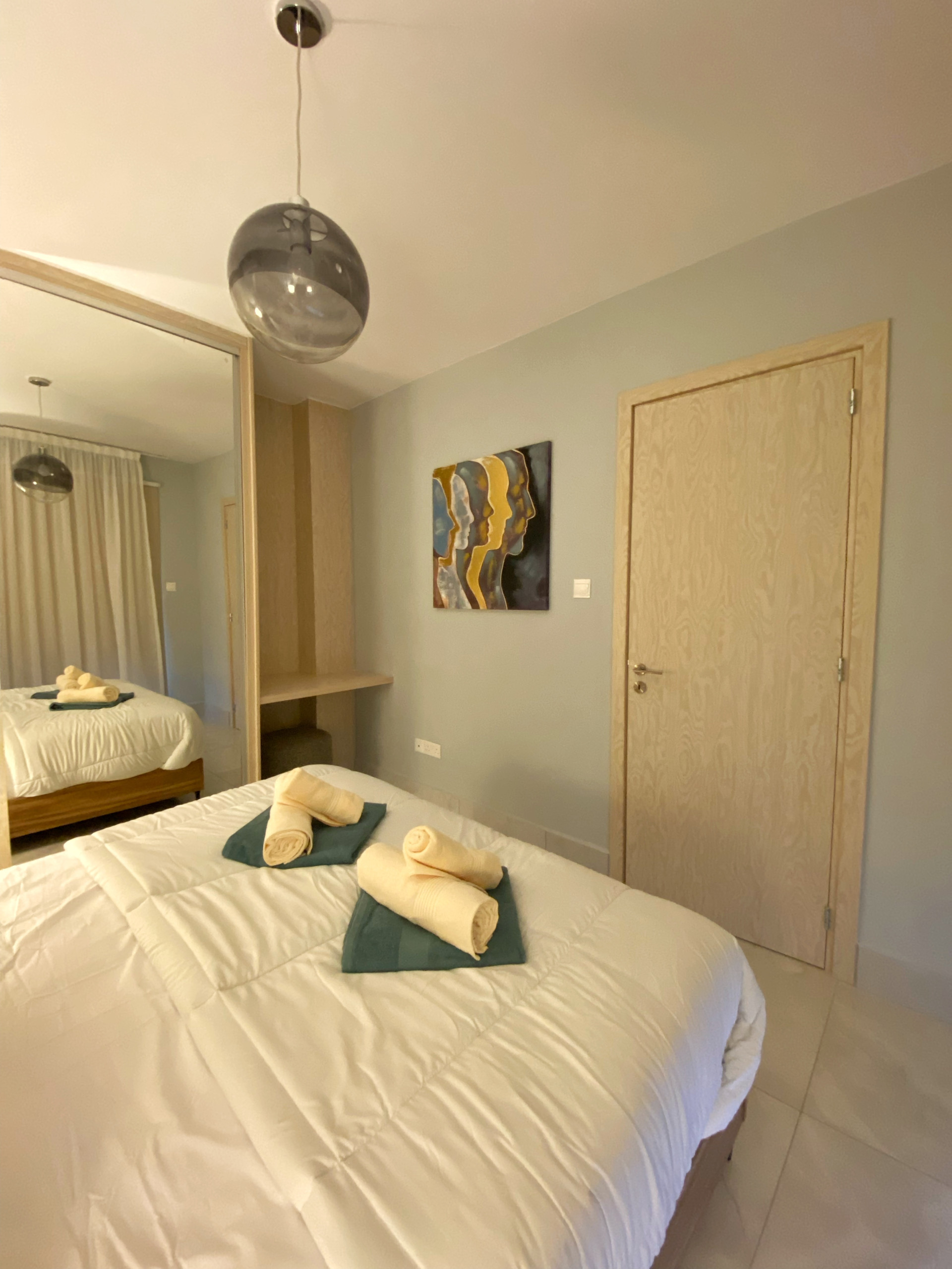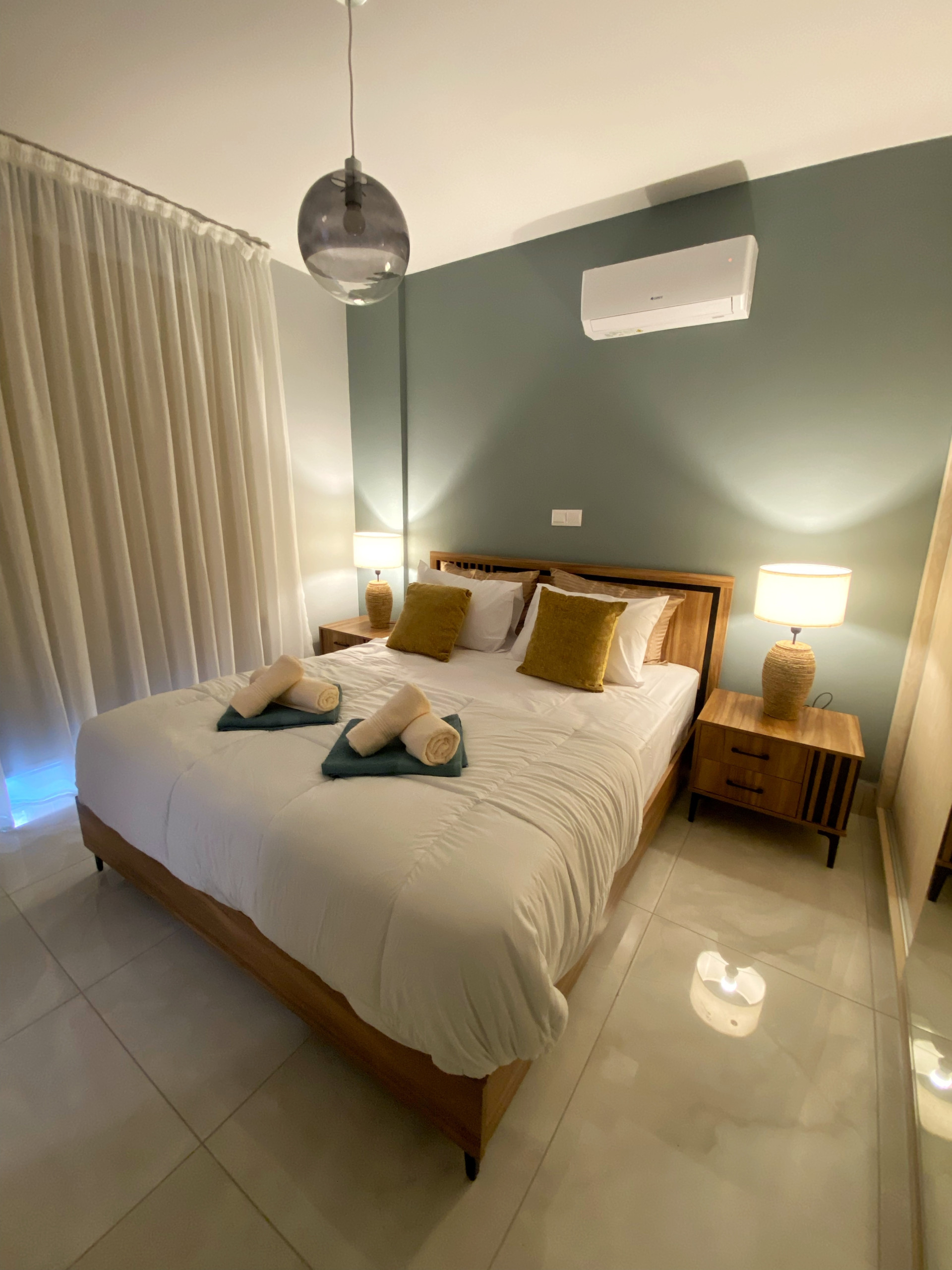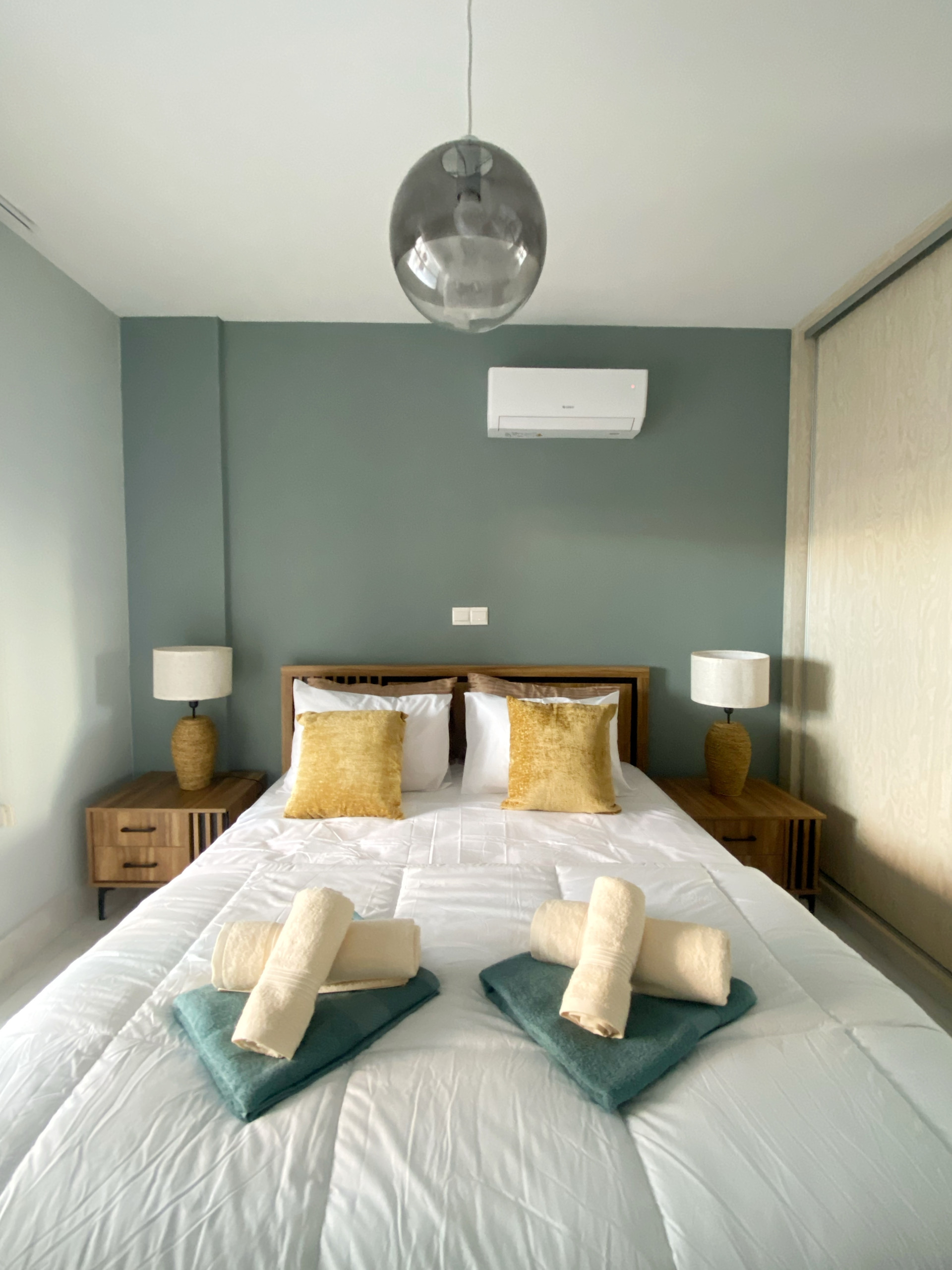 The inviting bedroom features a plush double bed, quality mattresses for a restful sleep, its own A/C unit, and spacious wardrobes for all your belongings.