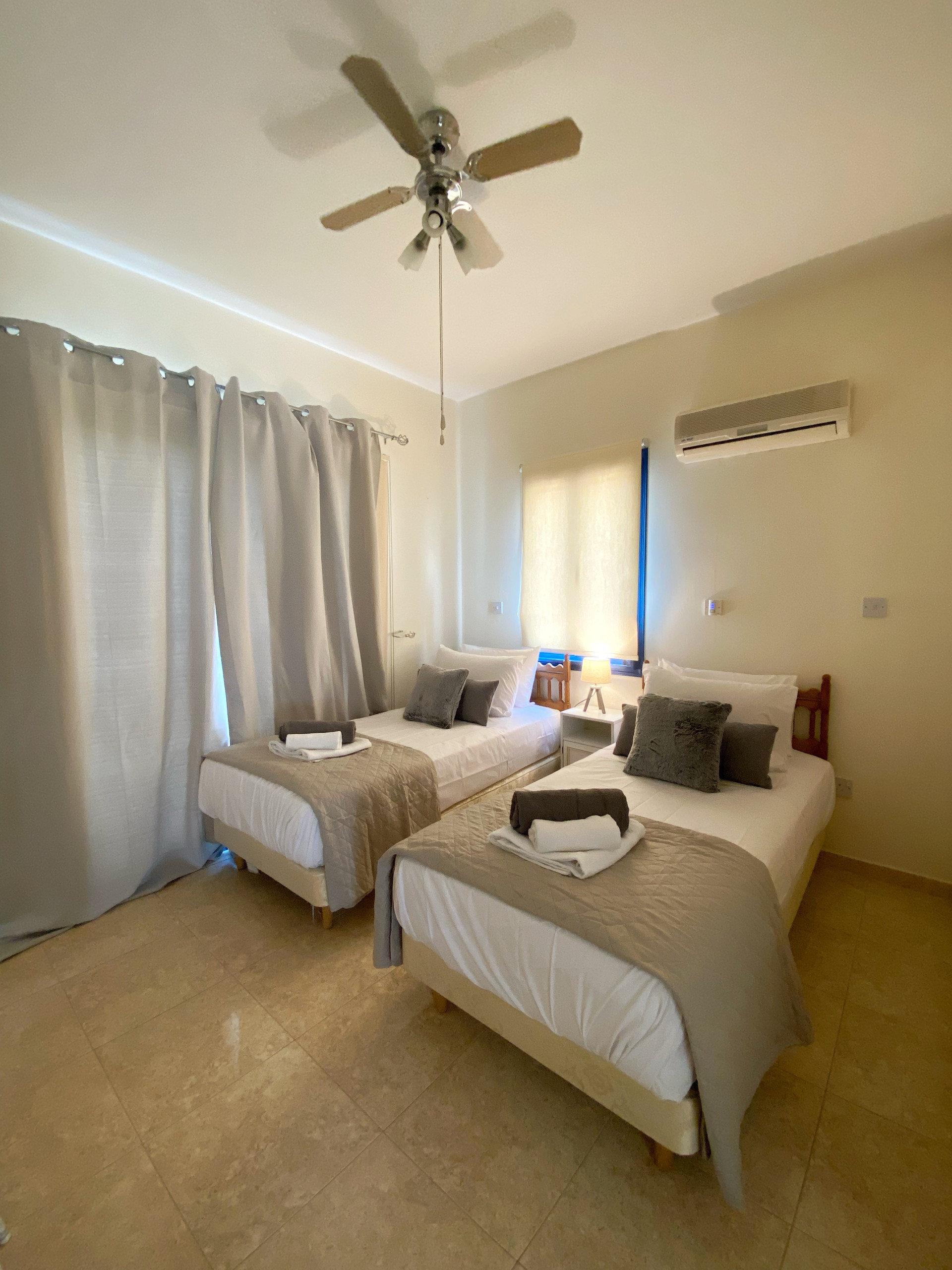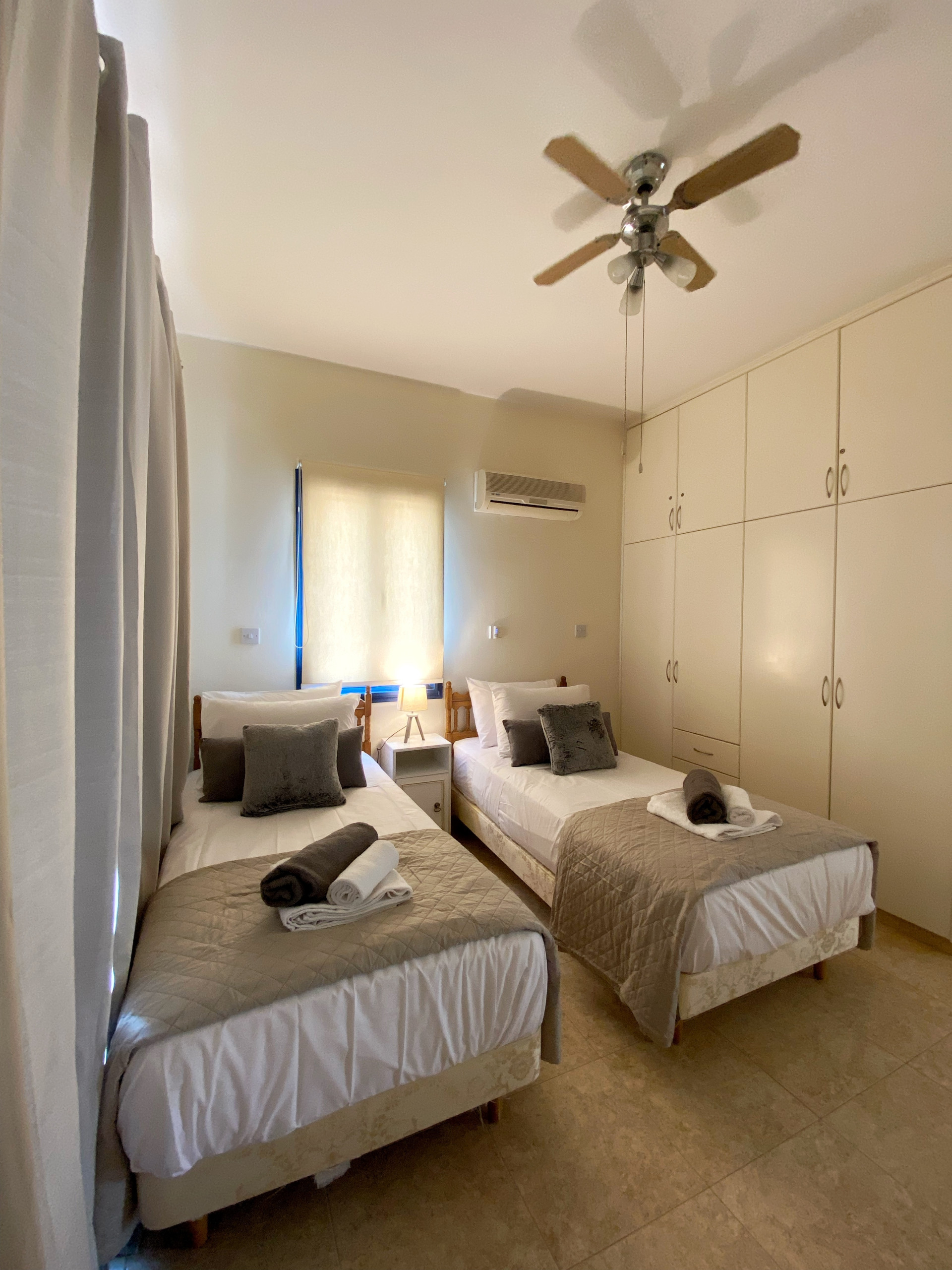 The apartment has 1 bedroom with two single beds thay you can put together if you wish where you can find comfortable mattresses that guarantee a comfortable sleep. The bedroom has its own a/c and offers storage wardrobes where you can store all your belongings.