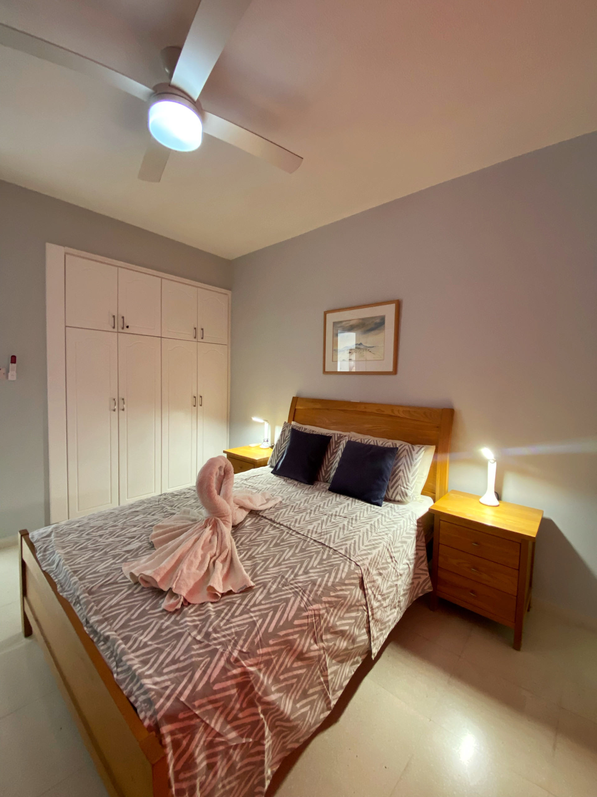 The apartment has 1 bedroom with two single beds thay you can put together if you wish where you can find comfortable mattresses that guarantee a comfortable sleep. The bedroom has its own a/c and offers storage wardrobes where you can store all your belongings.