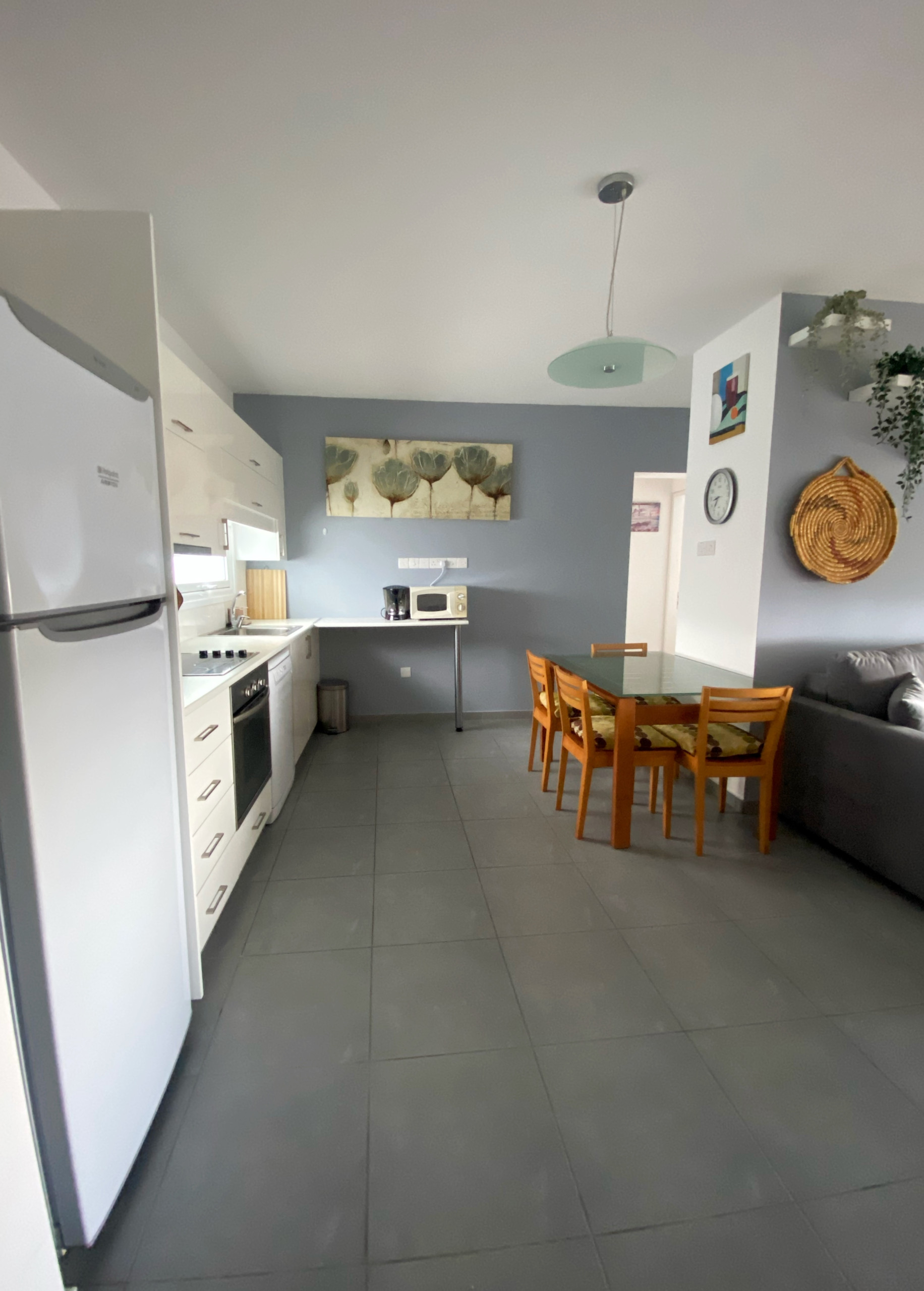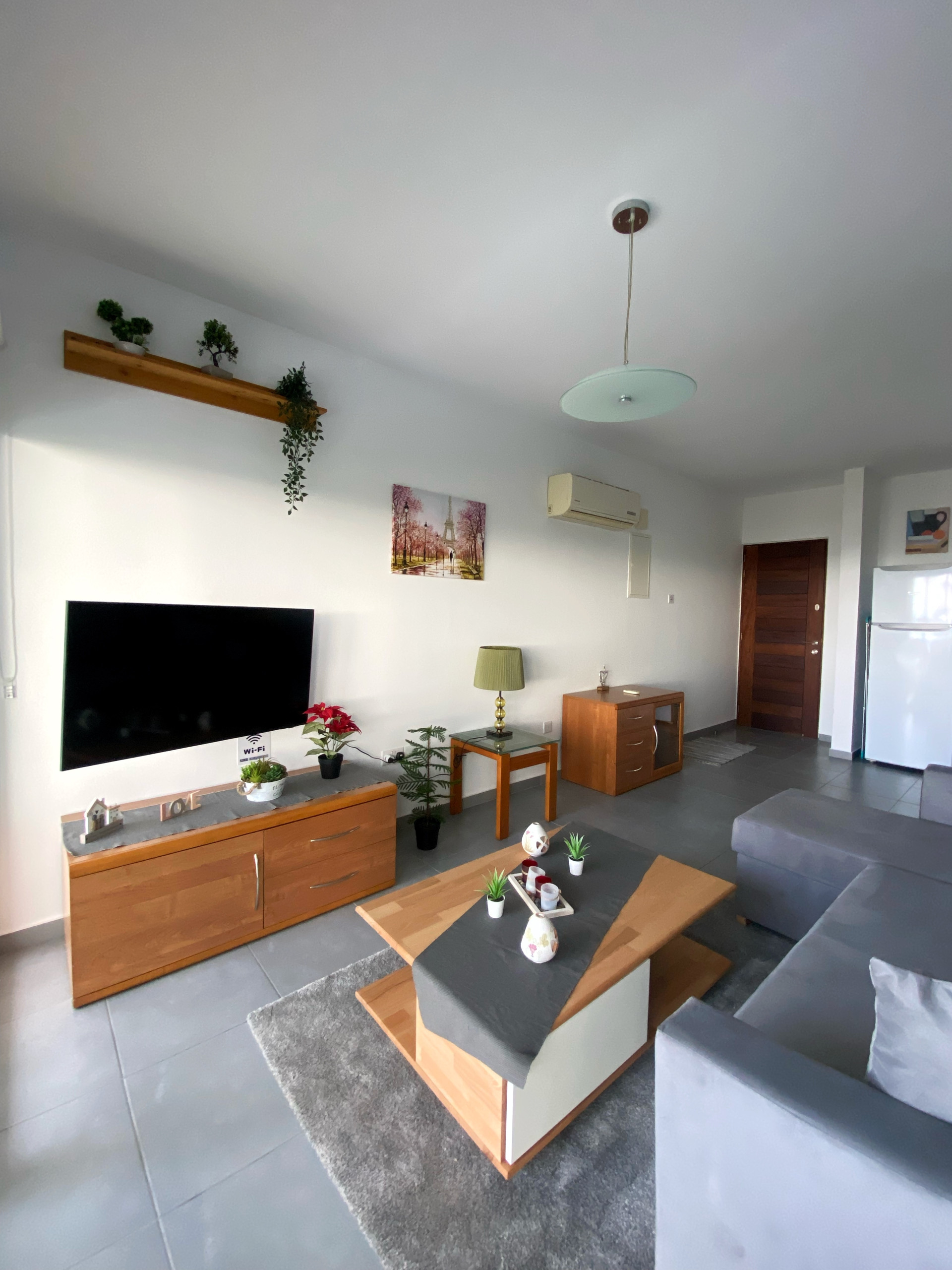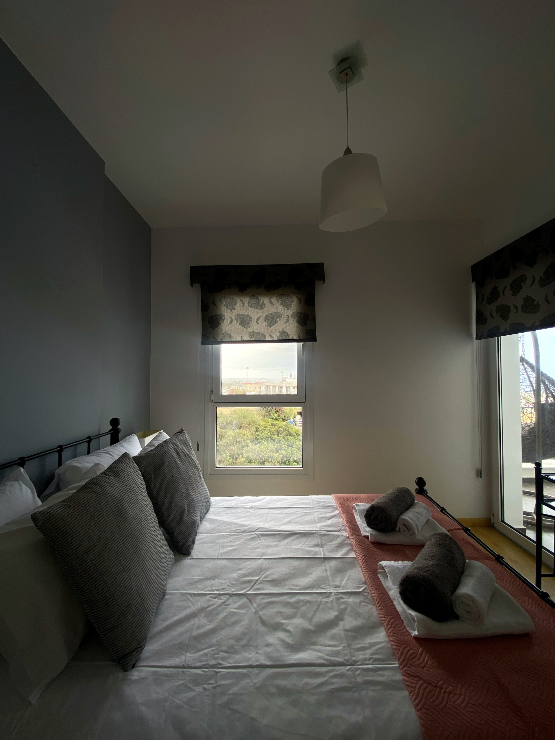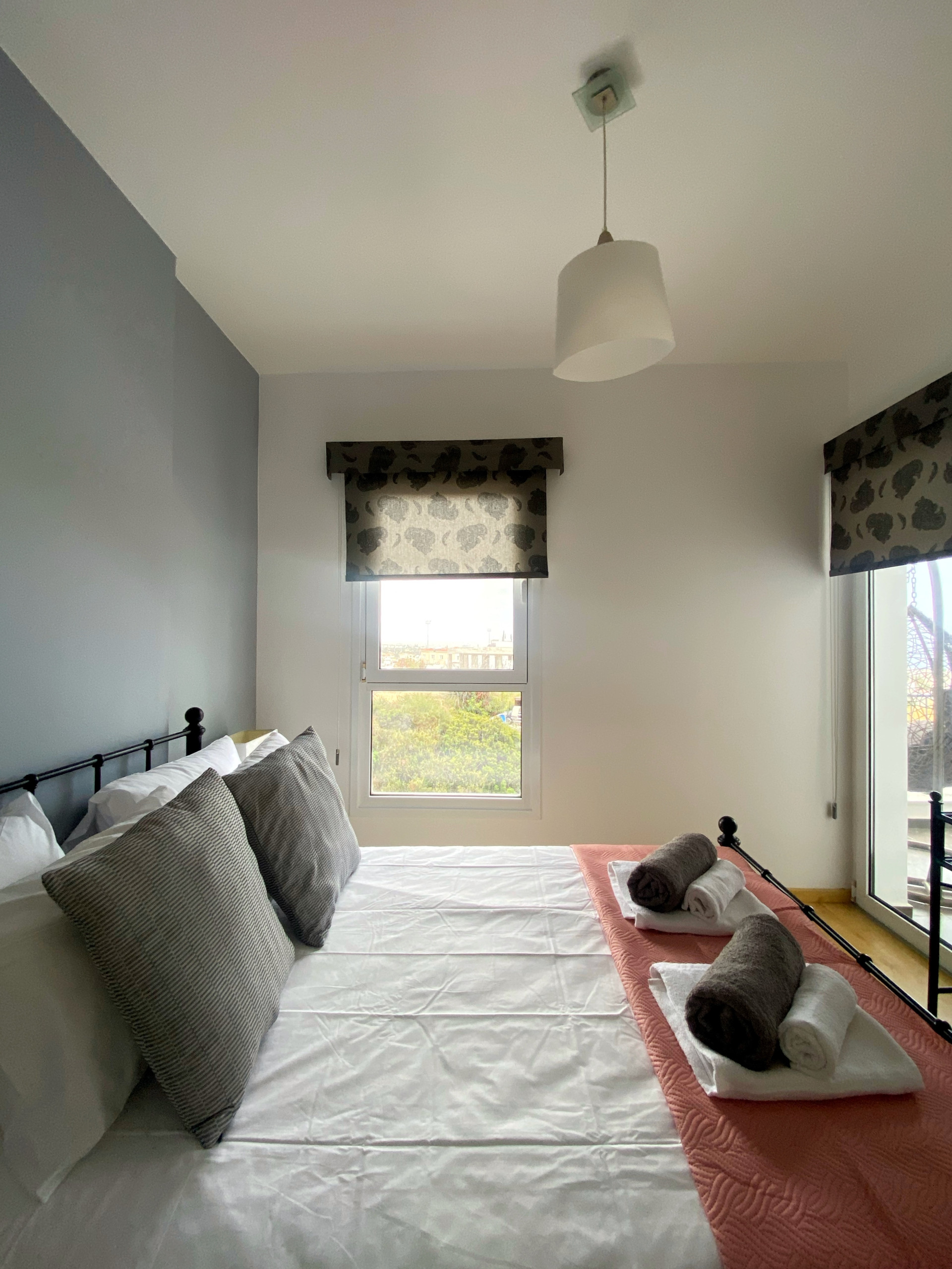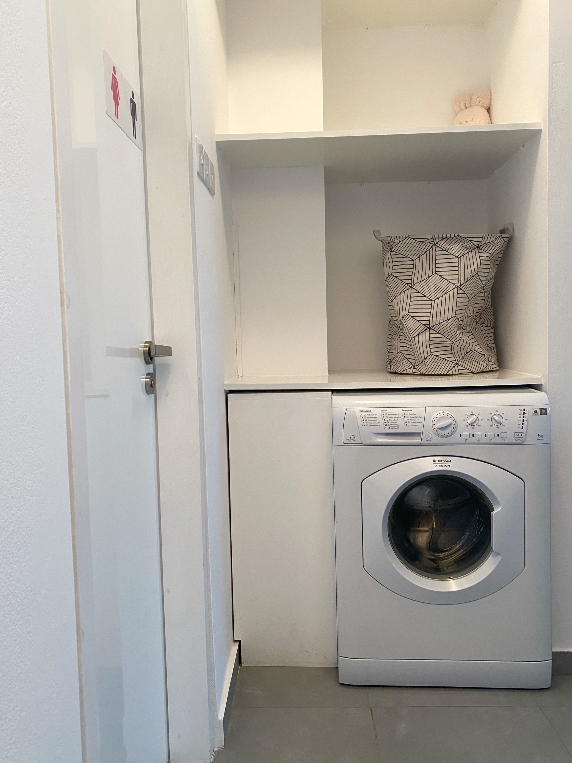 As you step inside the apartment, you will find an open living space that features a comfortable single sofa bed, a TV, a fully equipped kitchen, a dining table, and large sliding doors that let ample light come through and light up the space. The washing machine is available for your convenience.