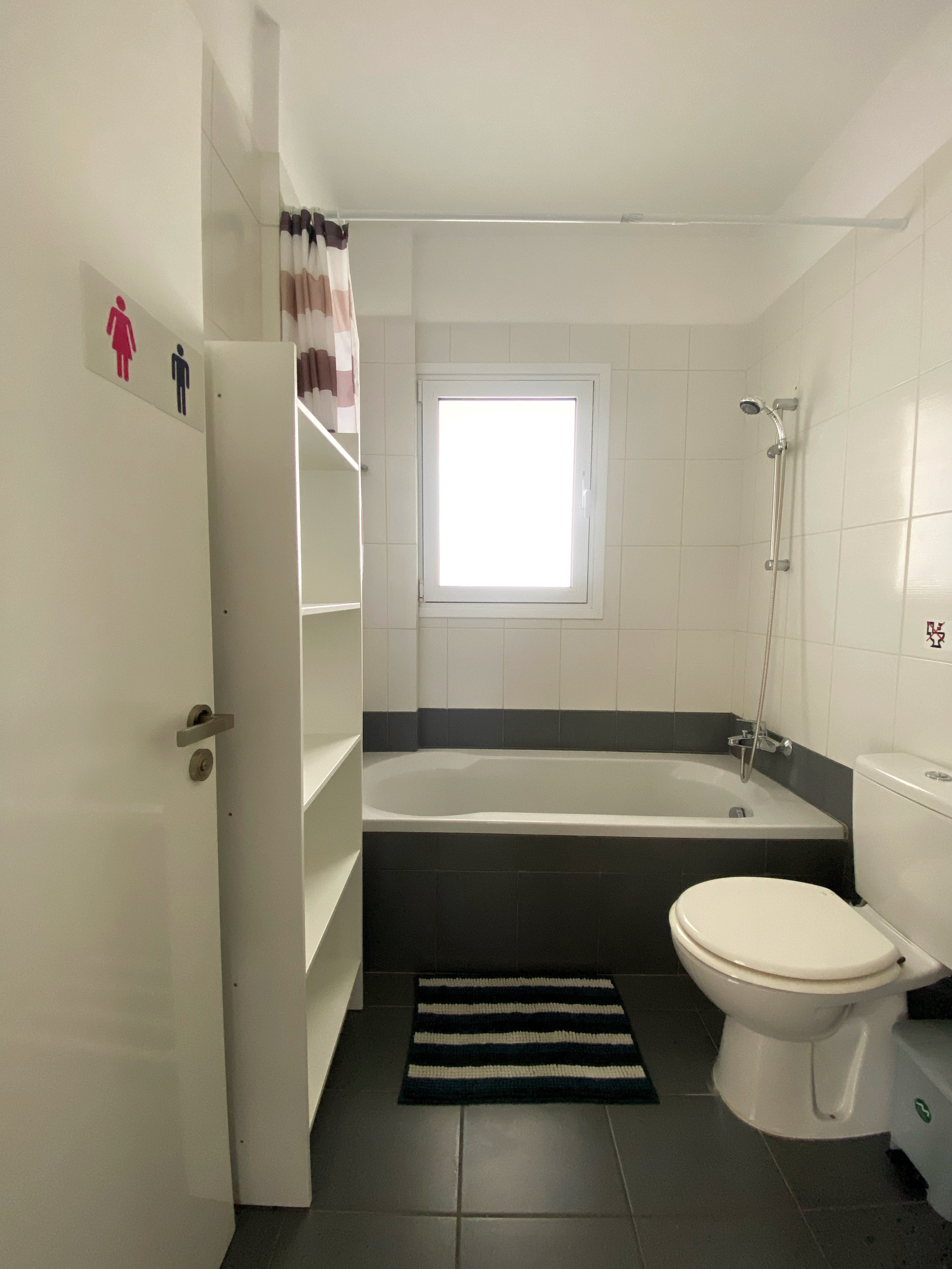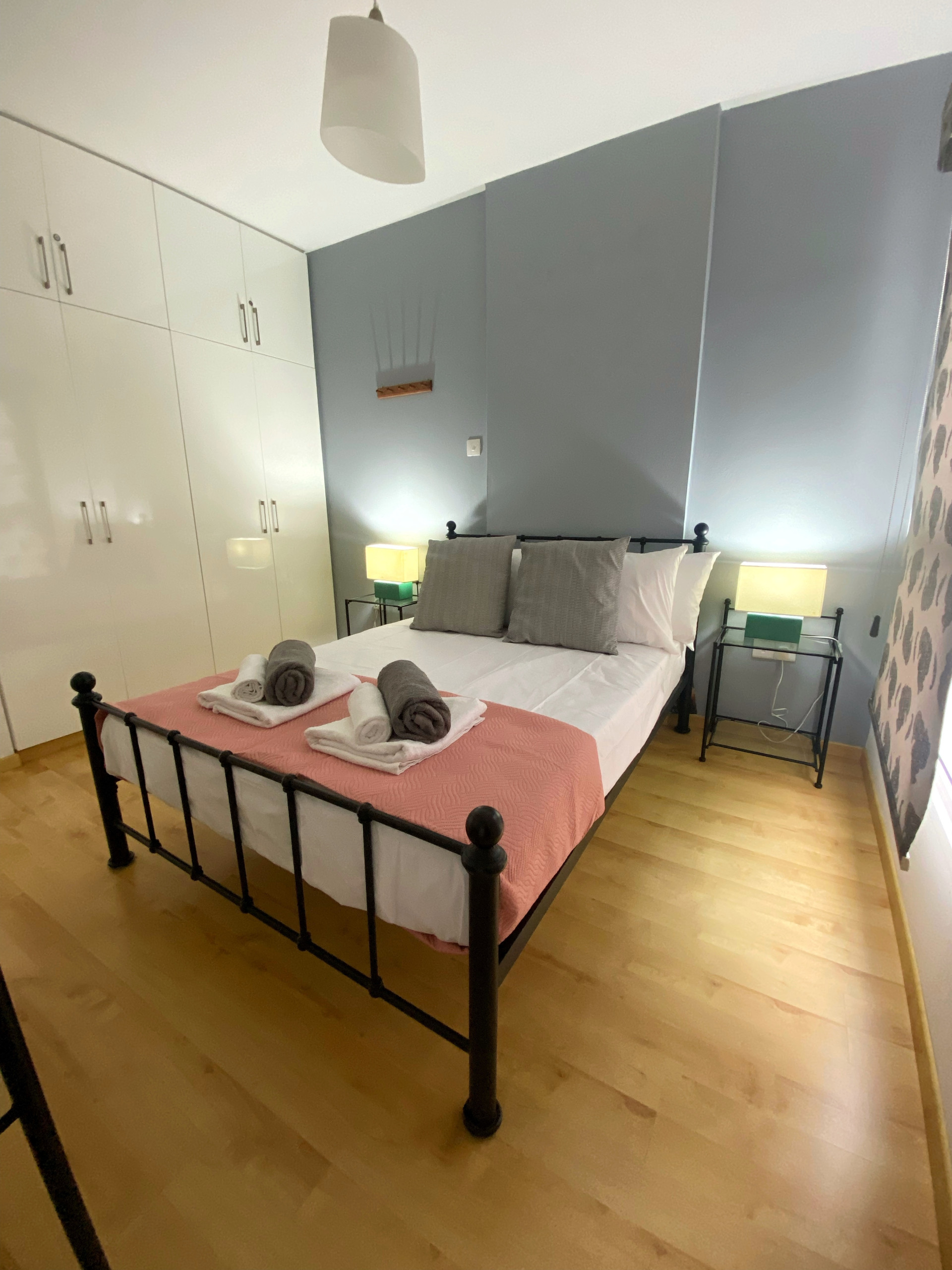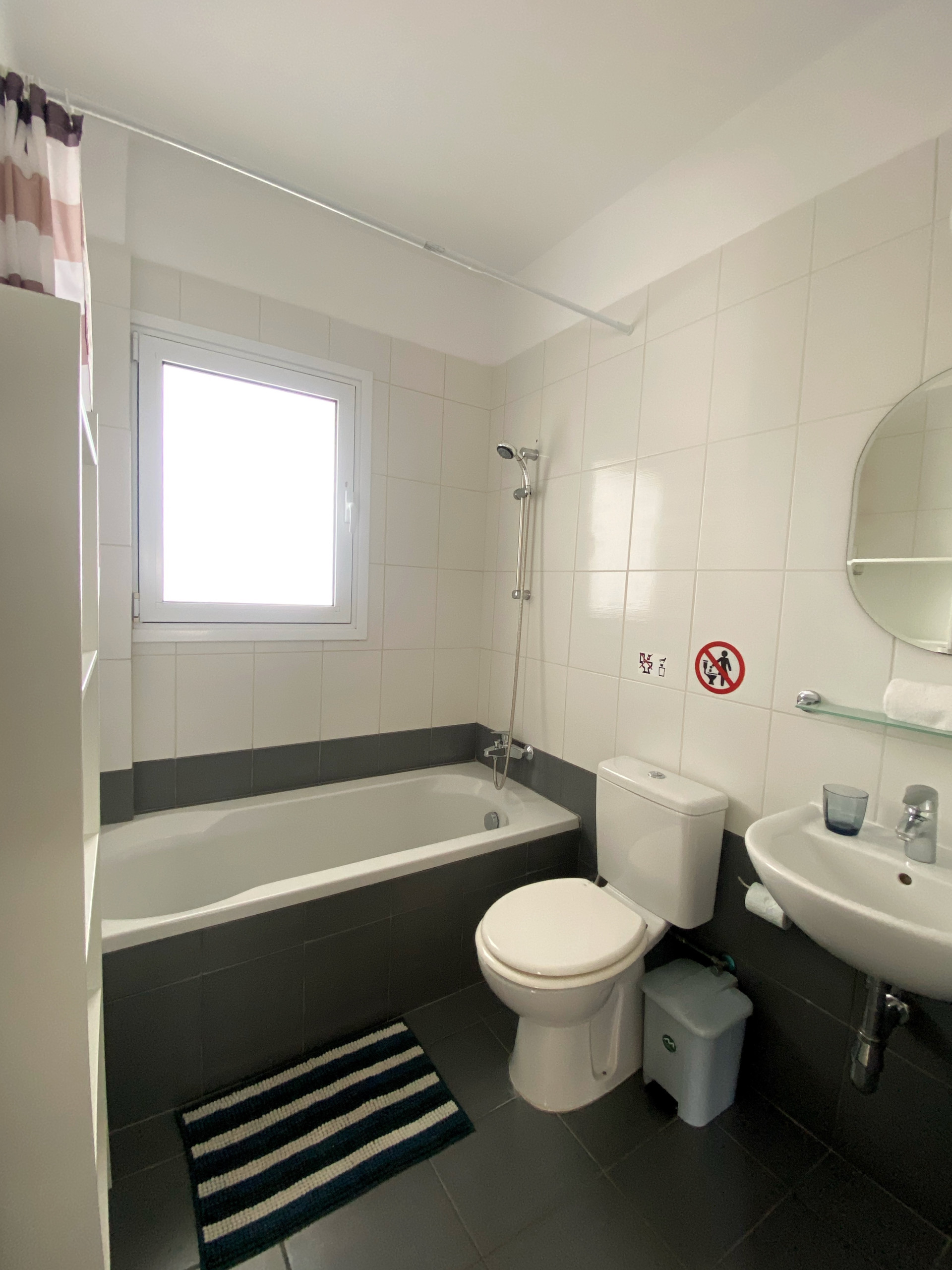The apartment has 2 bedrooms. The master bedroom that has a double bed and a wardrobe. In the second bedroom you will find two single beds. The bathroom features a bathtube with hot and cold water, a sink, and a toilet!