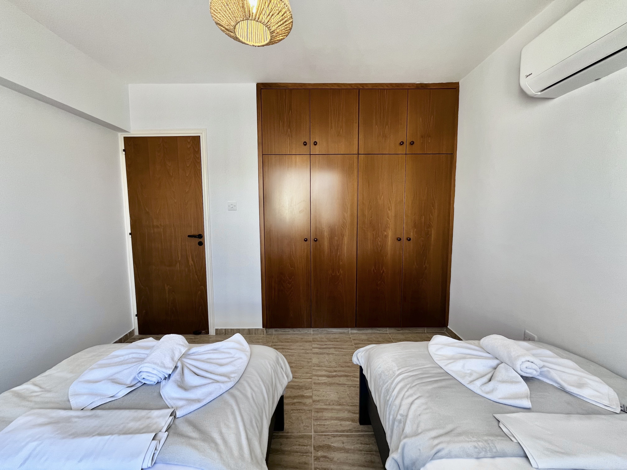 The master bedroom offers a comfortable double bed, wardrobe, and a small workspace with a mirror, ideal for getting ready or catching up on light tasks. The second bedroom features two single beds and its own wardrobe, making it great for families or friends traveling together.
