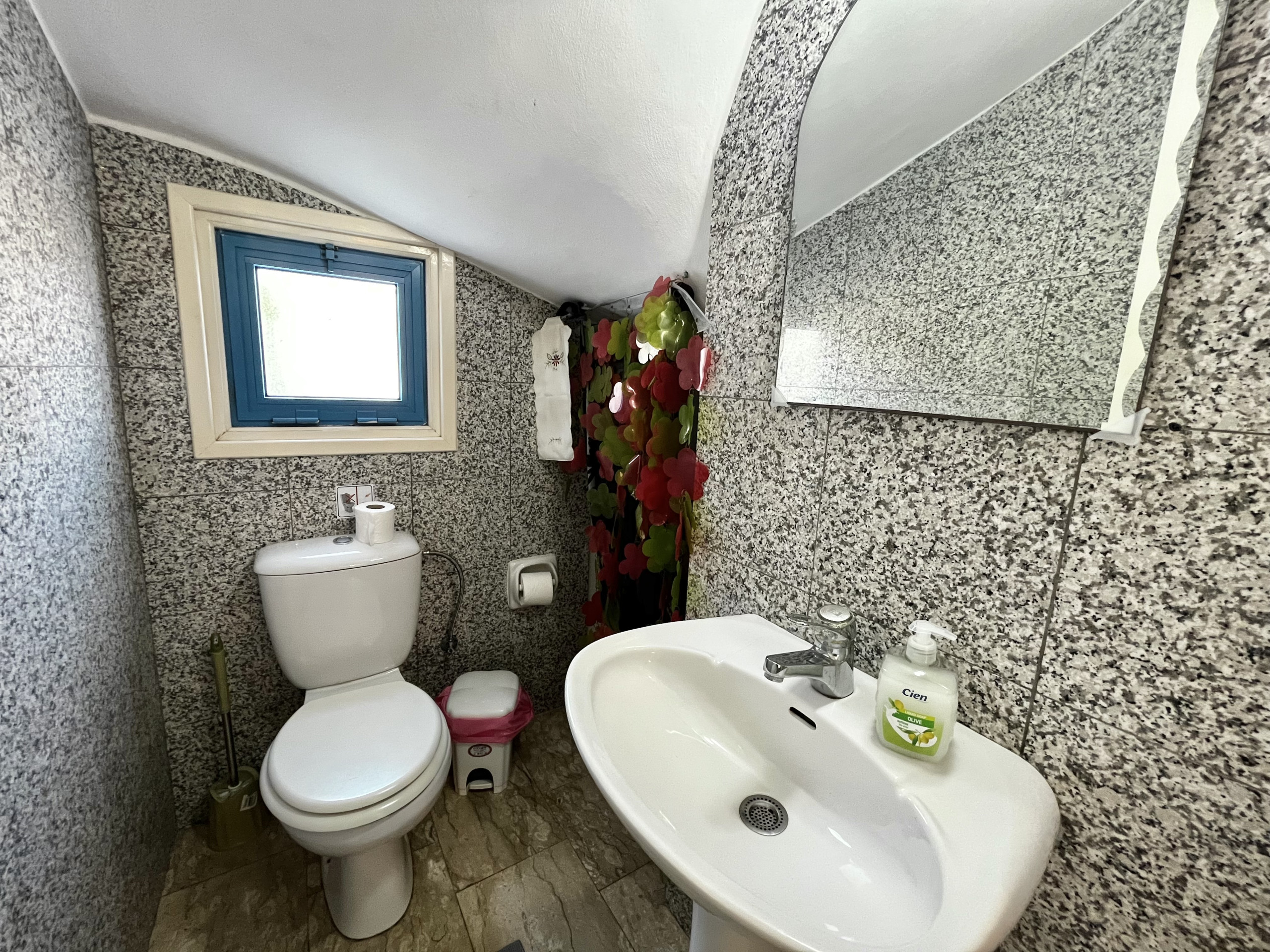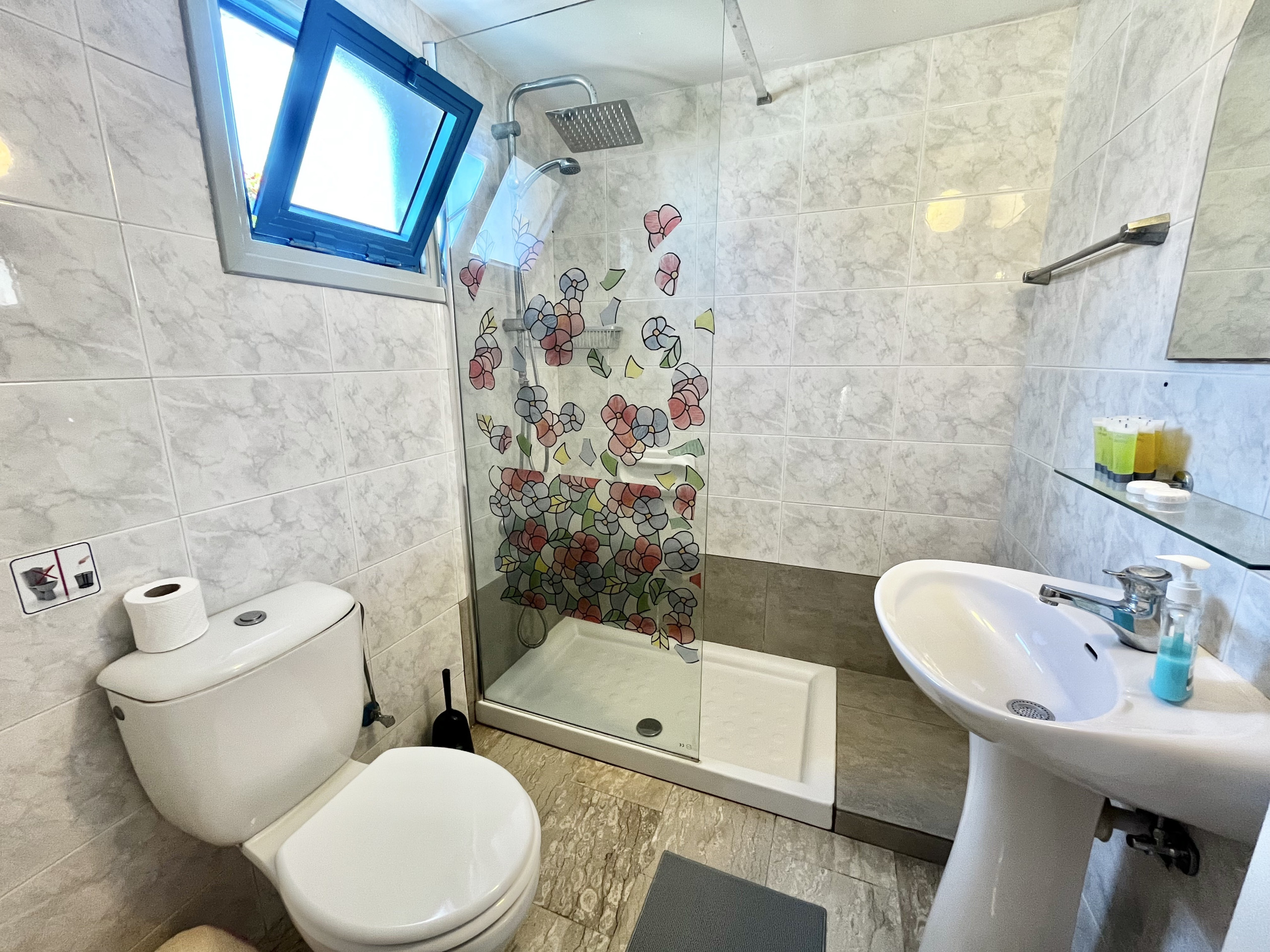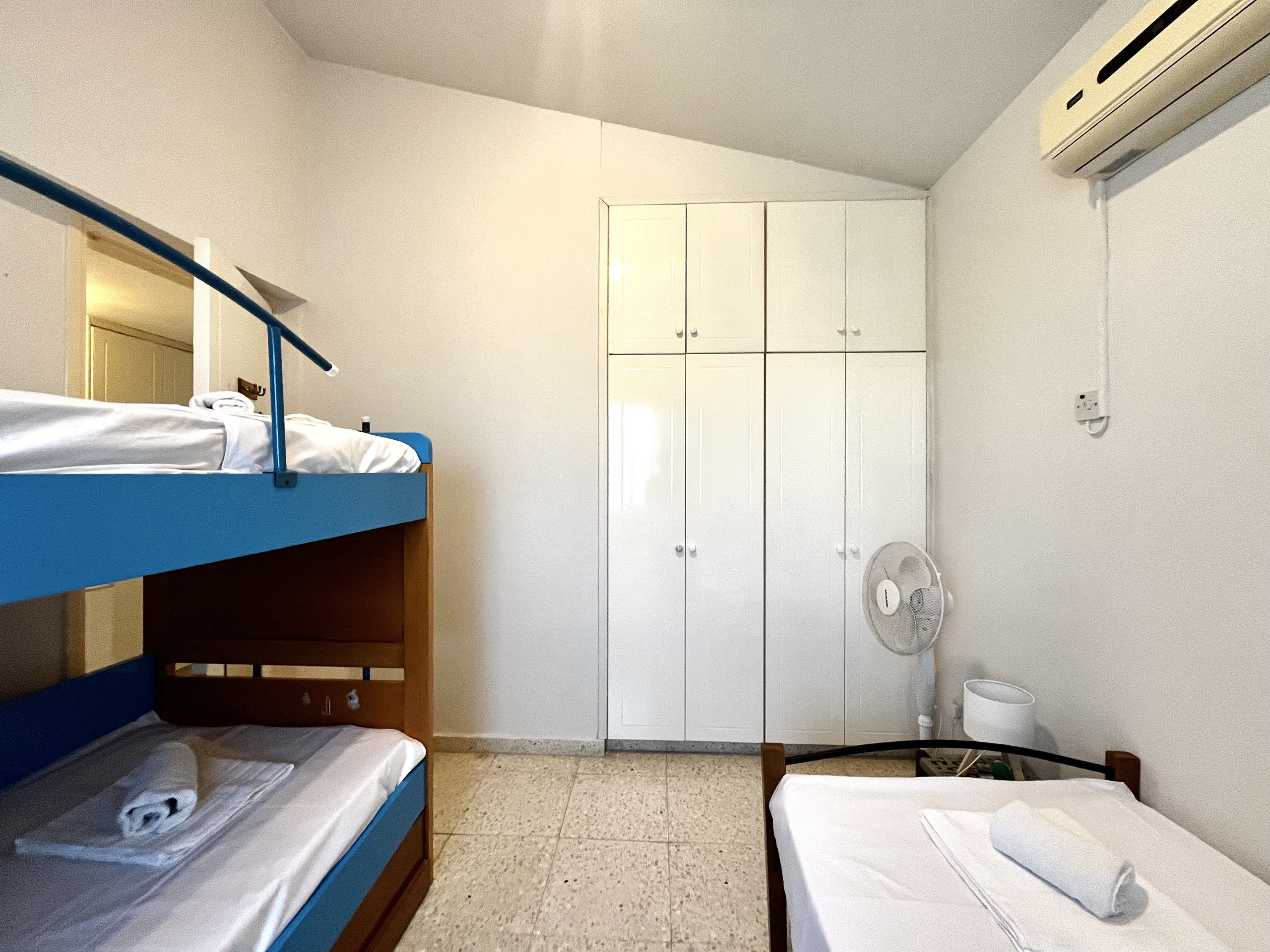 Upstairs, you’ll find two comfortable bedrooms: the master bedroom features a double bed, air conditioning, and a wardrobe, while the second bedroom is equipped with a bunk bed, a single bed, air conditioning, and storage space. A full bathroom with a shower is conveniently located on this floor as well.