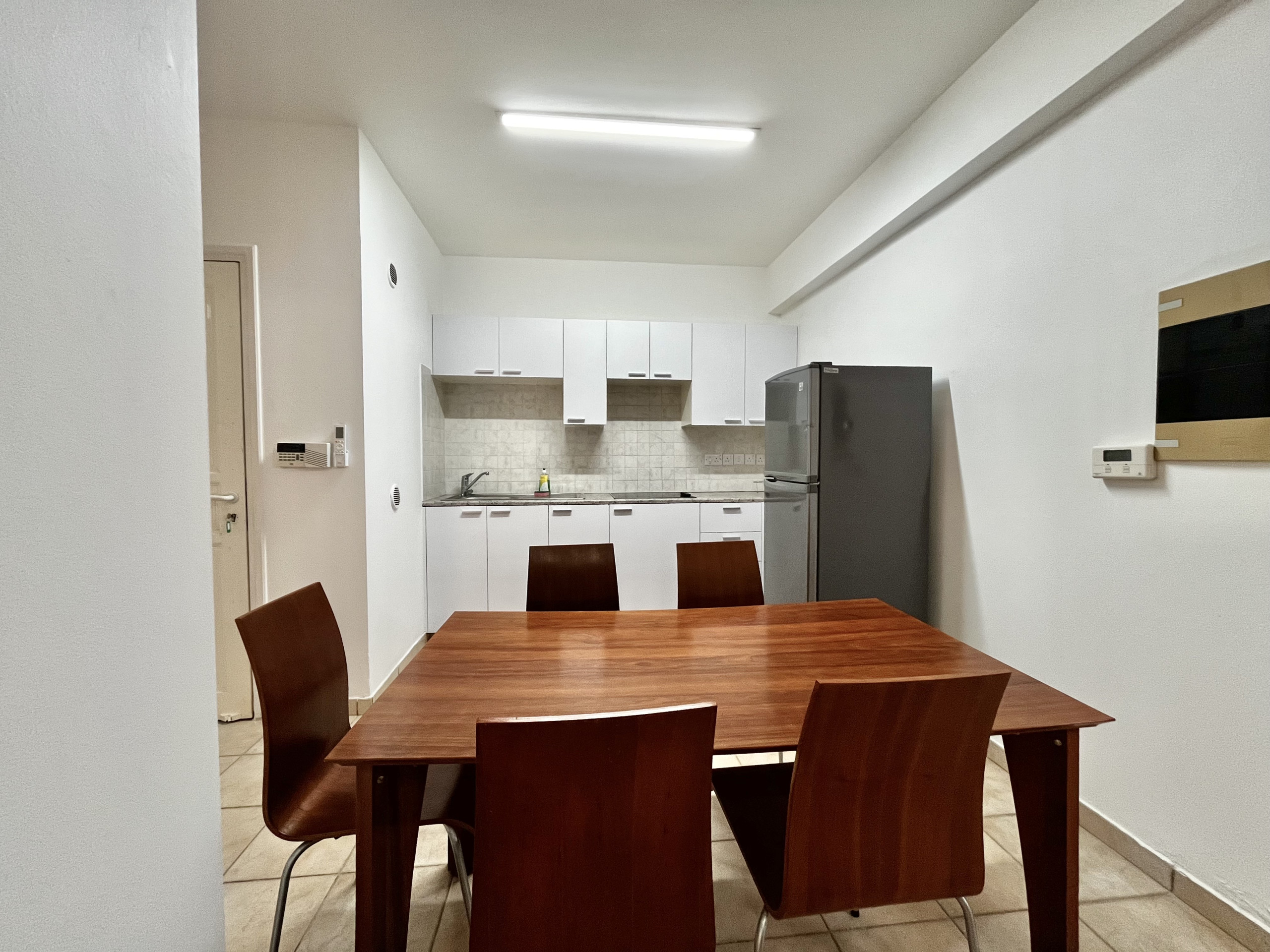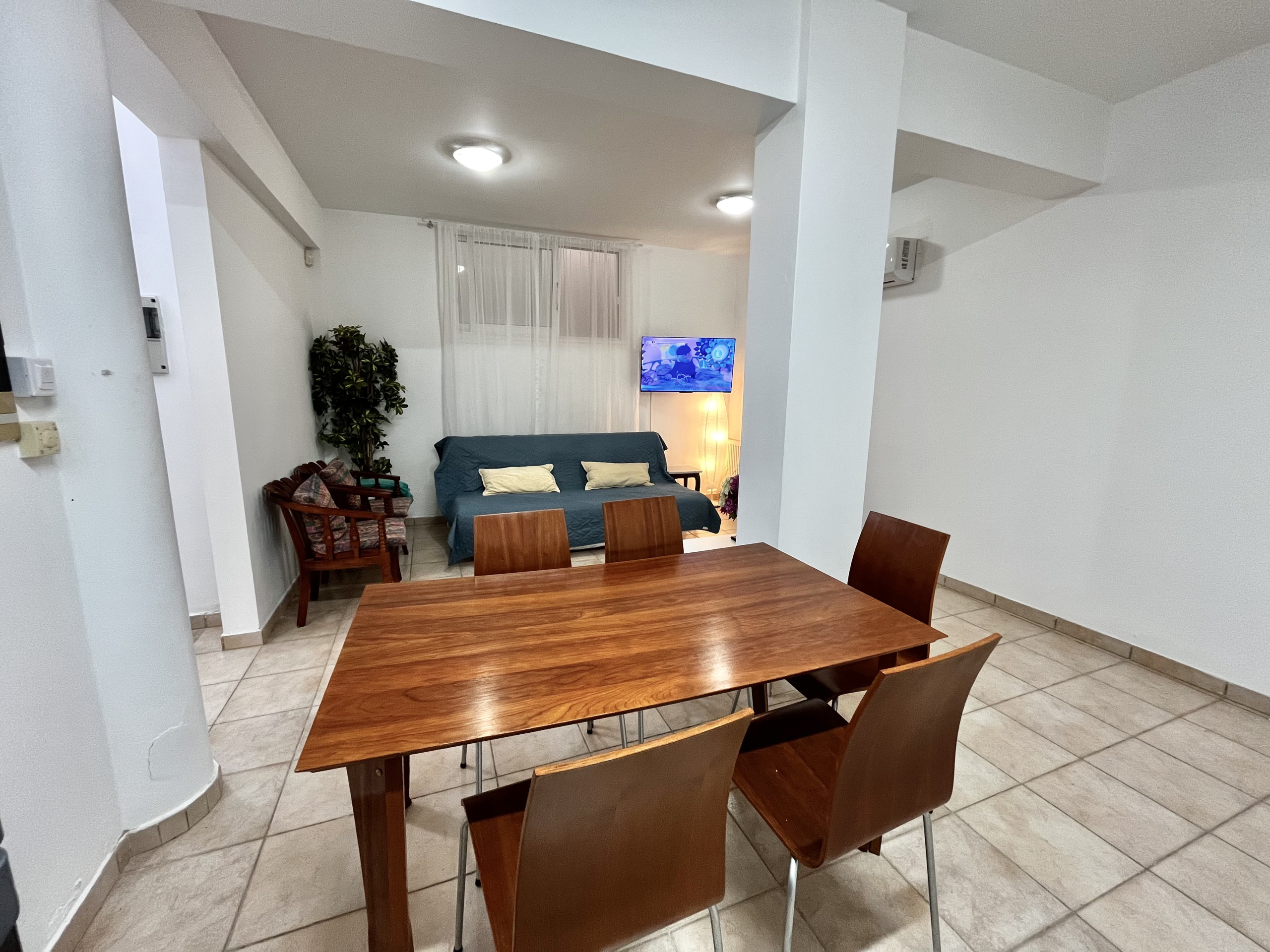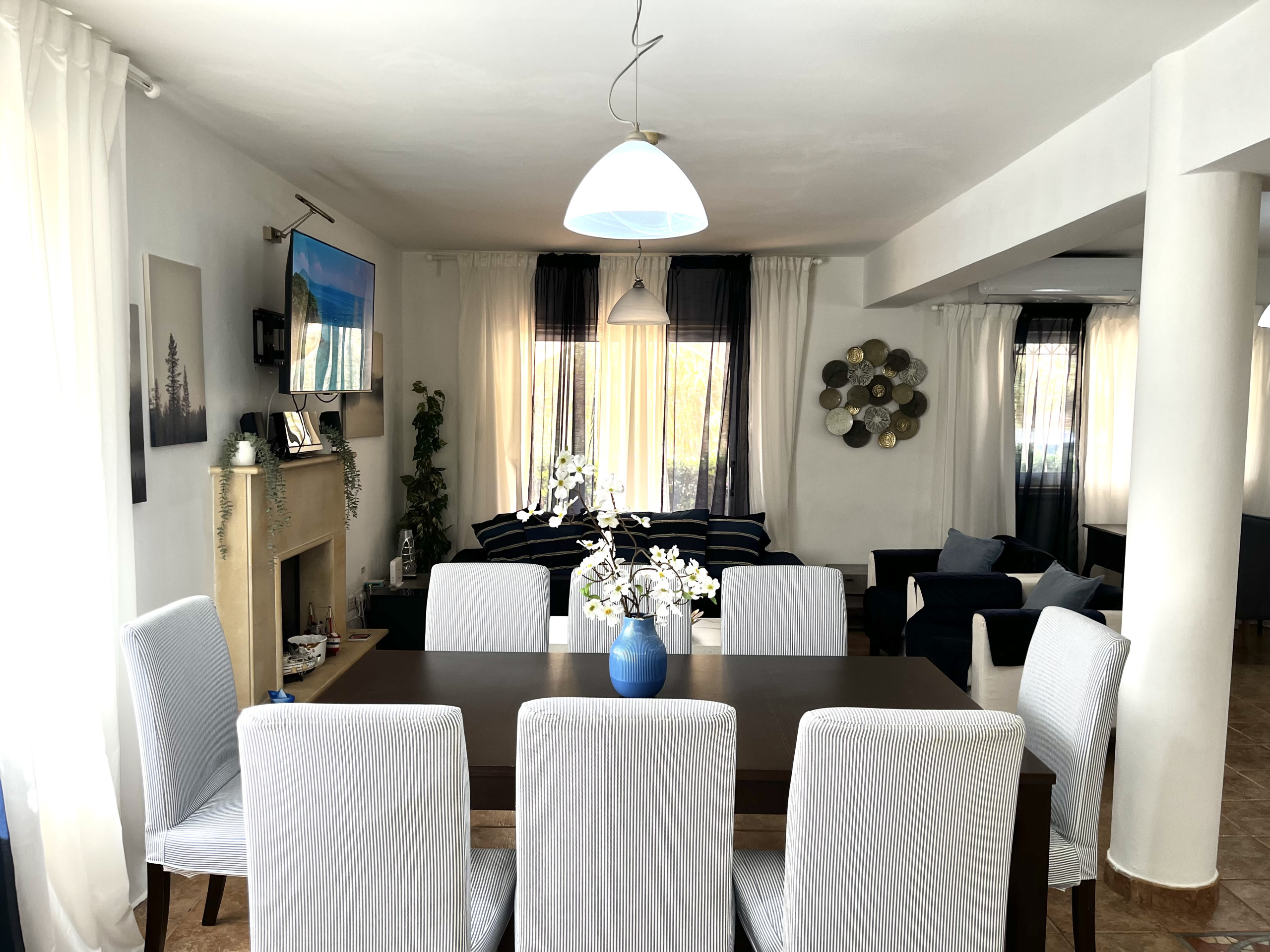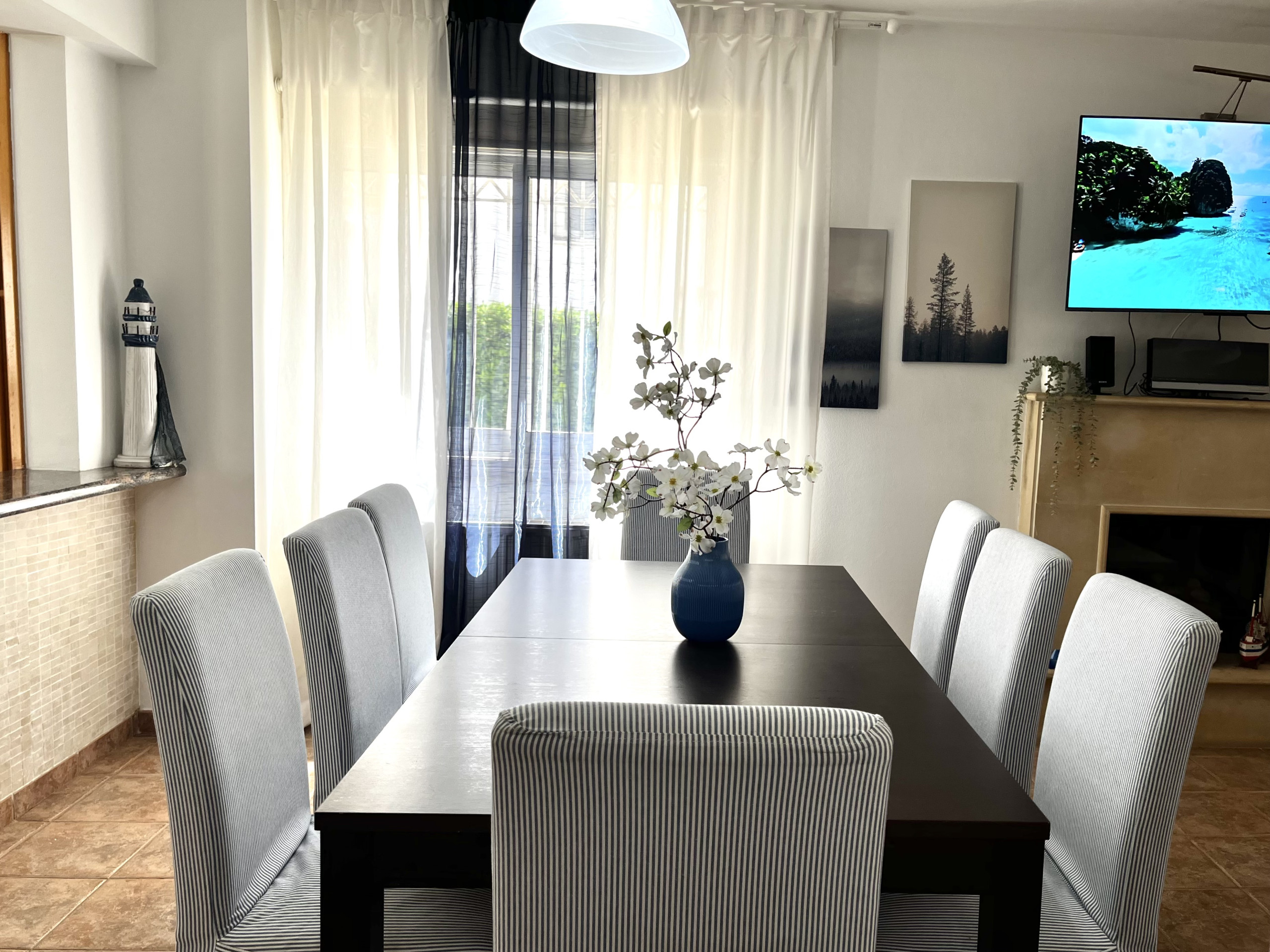 Adjacent to the living area, the fully equipped kitchen awaits, boasting appliances including a microwave, grill, toaster, coffee machine, dishwasher, and everything you might need. A large dining table beckons for shared meals and lively conversations, creating cherished moments together.