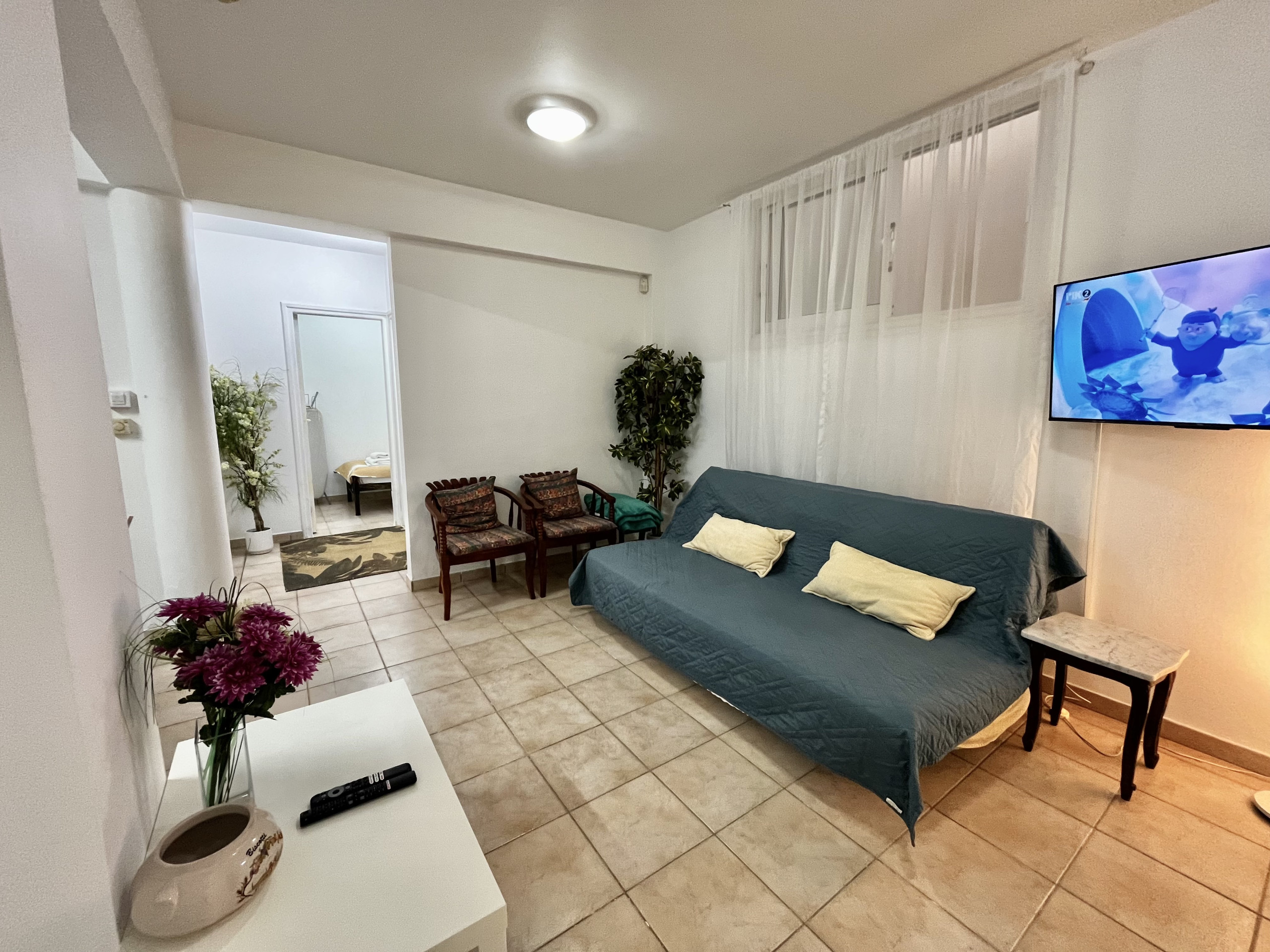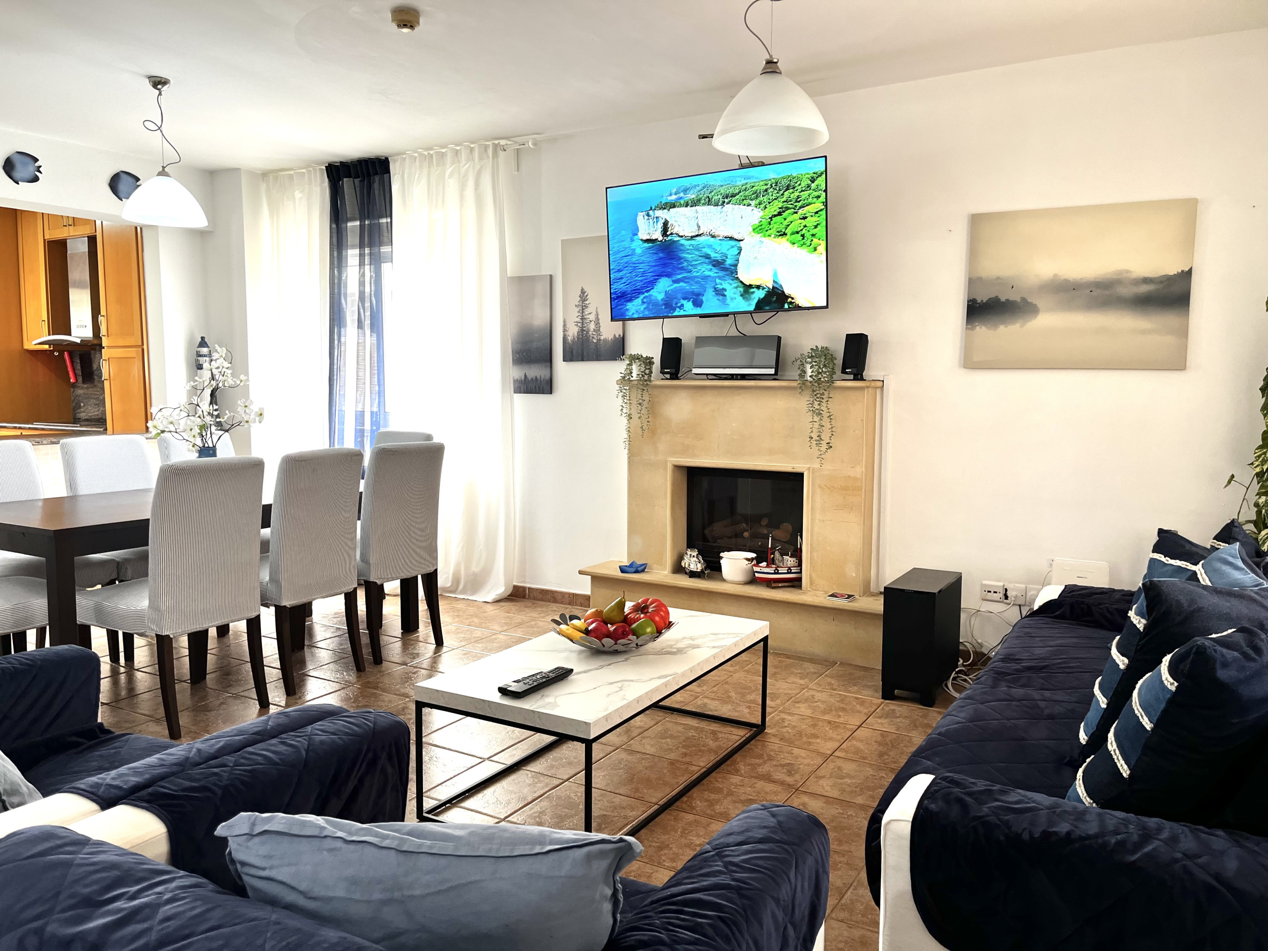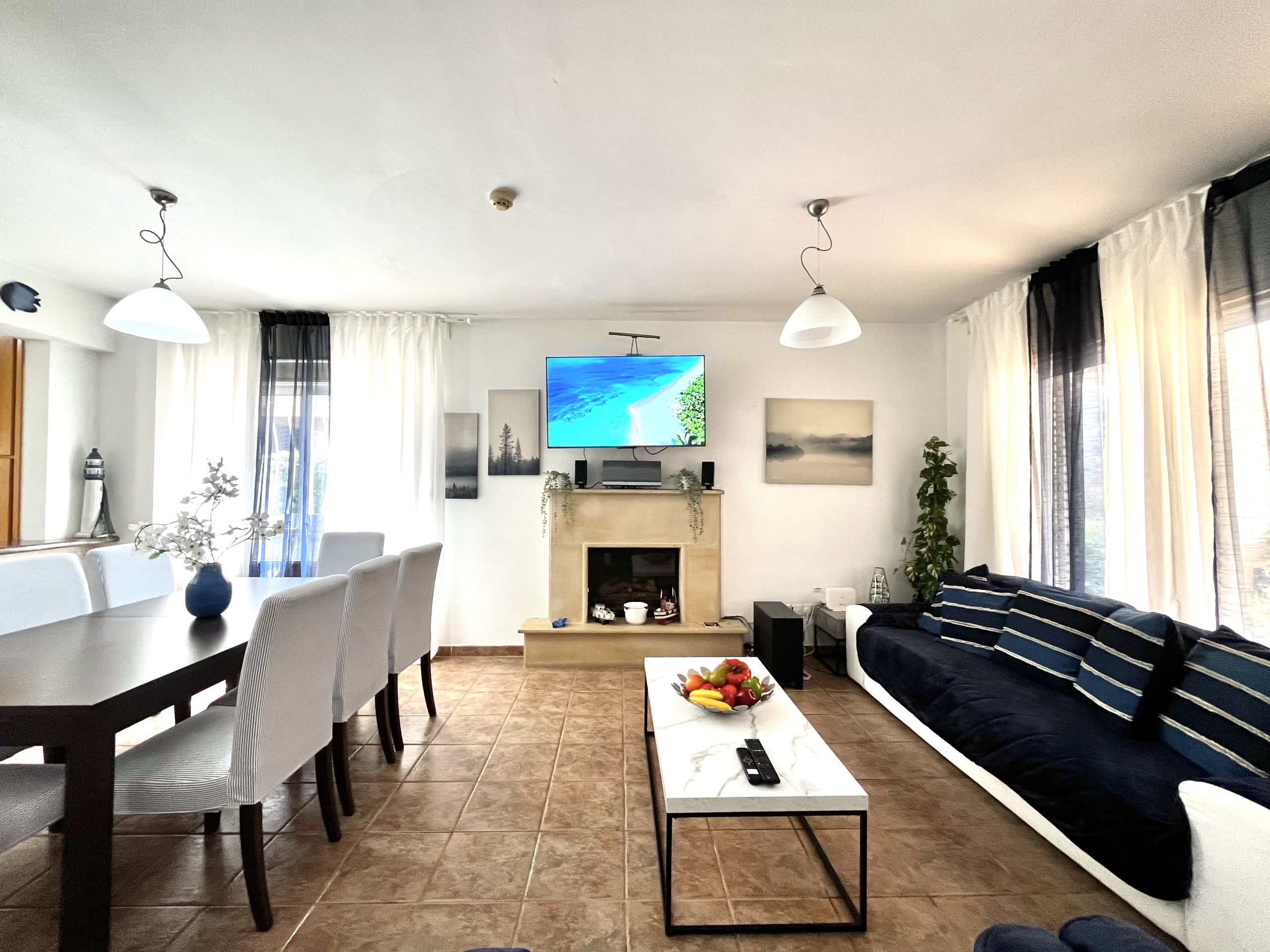 As you enter, a spacious living area greets you with a sofa, two armchairs, a TV, and a fireplace. It's the ideal spot for cozy evenings, whether you're watching your favorite shows.