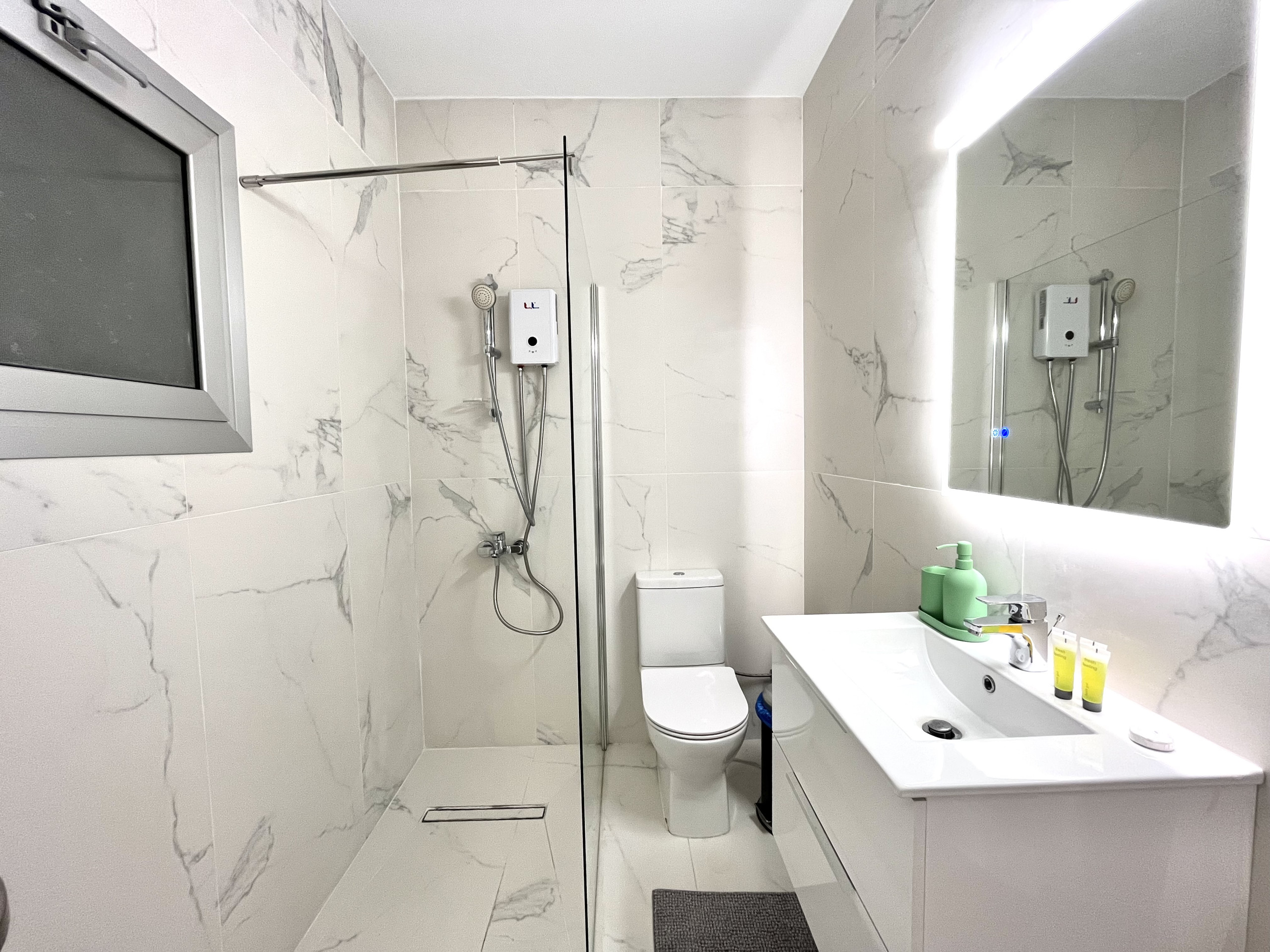 В апартаментах установлена двуспальная кровать с удобным матрасом, обеспечивающим комфортный сон. Ванная комната проста и удобна в использовании, предлагая приятный и удобный душ. Также в наличии стиральная машина для вашего комфортного проживания.